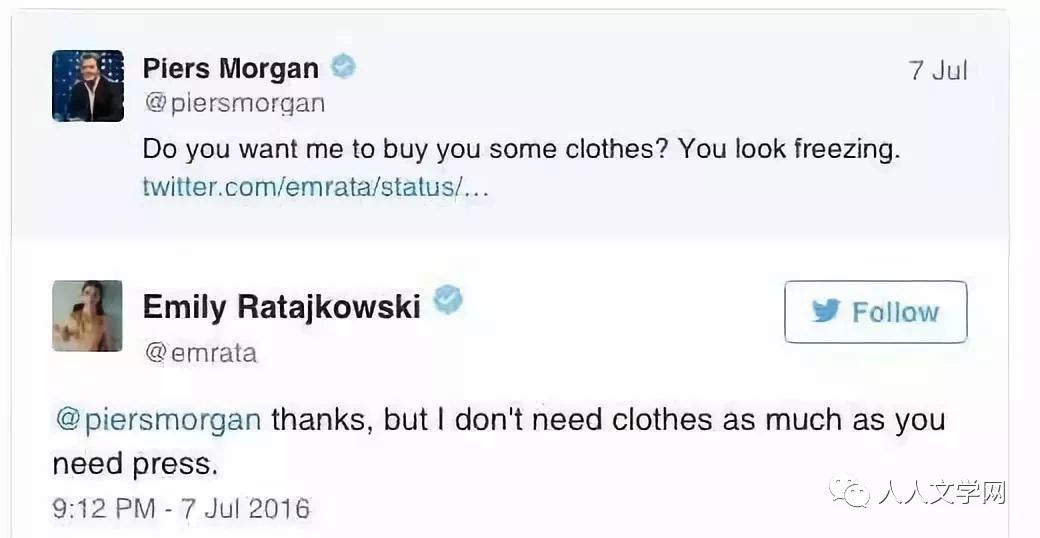 Emily则直接反击:“谢谢,我不像你需要哗众取宠那样需要衣服。”