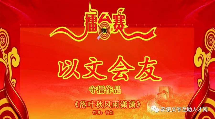 由吉林人民出版社、人人文学网、北京文墨轩文化发展有限公司、星缘文化传媒联合推出(纯)天使文学擂台赛 要求:长篇小说,30万字以上,错字率为二十万分之一。全文要用诗情画意的语言,全篇文字如行云流水。故事要引人入胜,中心思想明确,人物鲜活,情节环环紧扣,首尾前后照应,耐人寻味,意犹未尽。小标题要围绕大主题讲述故事,叙述中关键时刻要点题,通过讲述一个完整的故事来阐述人生的道理。 擂台赛作品征集办法及时间:参赛人员应是在中国工作生活的中国人;作品应由具有中国出版资质的中国出版社出版,须具有图书在版编目(CIP)数据;作品达到上述要求也可自己推荐,参赛时间以大赛得主出现为期限。大赛得主可签约人人文学网。在下一位擂主未出现时,可获得由星缘文化传媒提供的文学创作基金。 擂台得主奖金为30000.00元整(叁万元整) 擂台得主的推荐人或推荐单位可得奖金10000.00元整(壹万元整) 参赛作品需寄样书3本附大赛表格一张。(邮费自付) 注:大赛表格附在《落叶秋风雨潇潇》第三版最后一页。 联系QQ:1187295260 王老师