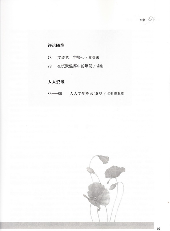 《人人文学》第一期发表作品目录,请作者把通信地址发到1187295260@qq.com 邮箱,或微信联系:renrenwenxue王老师,以便快递样刊。谢谢。