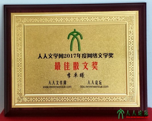 作为人人文学网的忠实粉丝,我每天都在这个平台拜读名家名作,汲取养分,偶尔发篇小文与网友共享,倒也颇受好评。突然接到人人文学奖评委会的通知,告知我获得了人人文学网2017年度网络文学奖——最佳散文奖,实属意外,惊喜万分……仔细想来,人人文学网把这么荣耀的奖项颁给我,应该是对新人的激励与鞭策,感谢各位评委老师和广大网友对我的赏识与厚爱,我唯有再接再厉才不负众望。