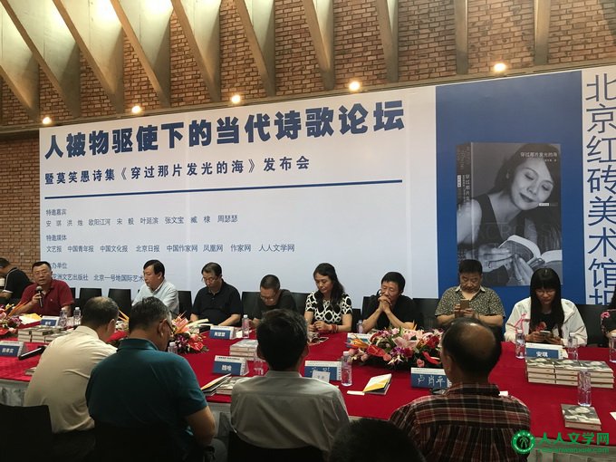 人人文学网讯: “人被物驱使下的当代诗歌”论坛暨莫笑愚诗集《穿过那片发光的海》发布会于2018年7月28日在北京红砖美术馆召开,活动由百花洲文艺出版社、北京一号地国际艺术区联合主办。诗人、批评家周瑟瑟主持了活动。诗人叶延滨、欧阳江河、臧棣、安琪、洪烛,作家、编剧顾晓阳,中国农业出版社副总编宋毅等参加活动并发言。北京一号地艺术区发展理事会理事长张文宝致辞。