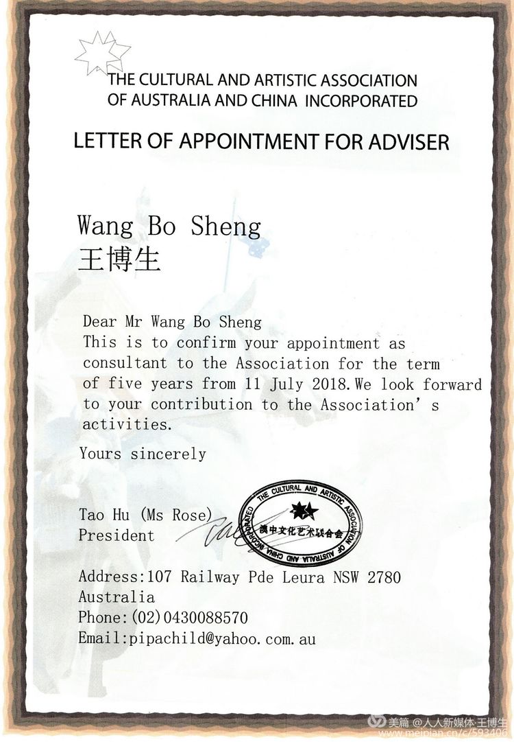王博生担任澳大利亚澳中文化艺术联合会顾问