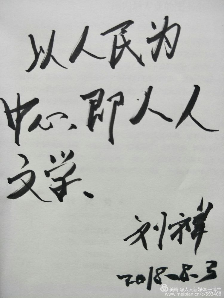 人人快讯:人人文学网总编、中国书画春晚总策划王博生与人人文学网主编周步,人人文学杂志主编萧士平拜访《运河》杂志主编刘祥老师。并把《人人文学》杂志及散文集《梅兰竹菊》赠送刘老师指正。刘老师为人人文学杂志题词:以人民为中心,即人人文学。刘祥老师为通州运河文学发展及作家培养做了大量工作……