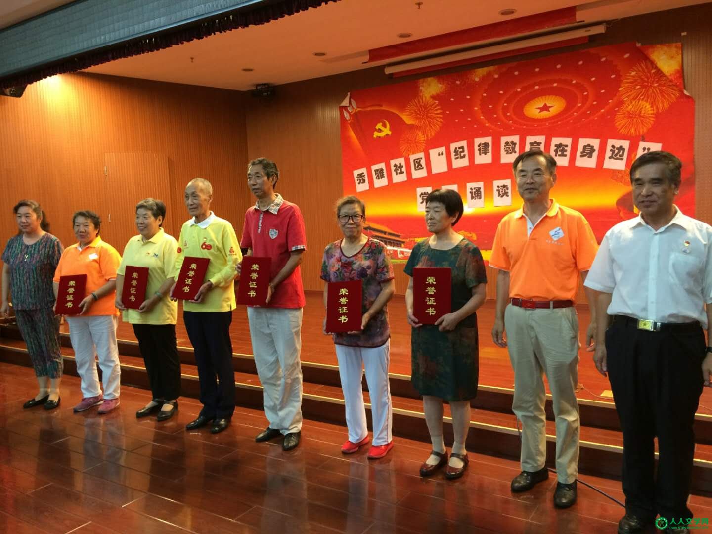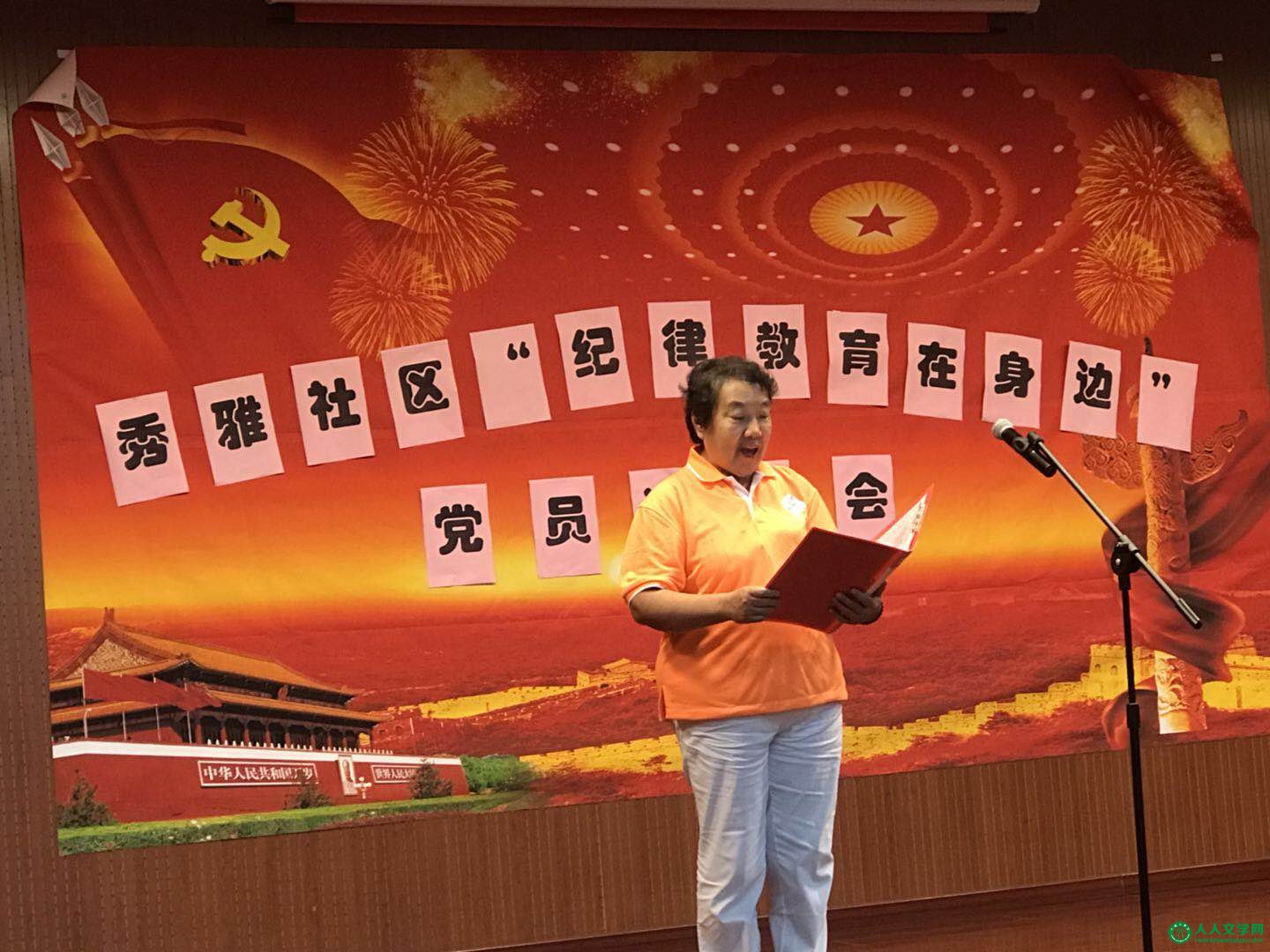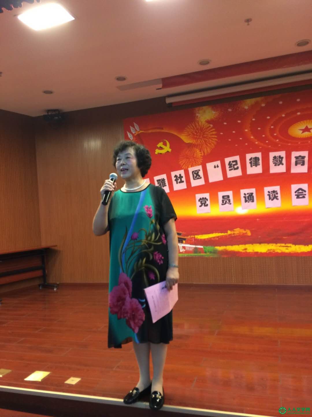 8月30日早上,近百名秀雅社区党员和居民冒雨赶到大屯邻里中心,参加《“纪律教育在身边”党员诵读会》。大会由艺术团长朱树荆主持。