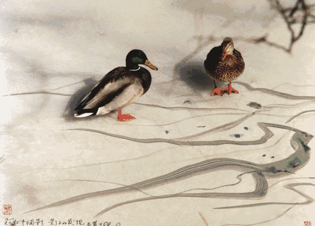 这幅由著名艺术家韩美林补画并题字, 《双鸟》栖息于冬日的枝头。 ▼