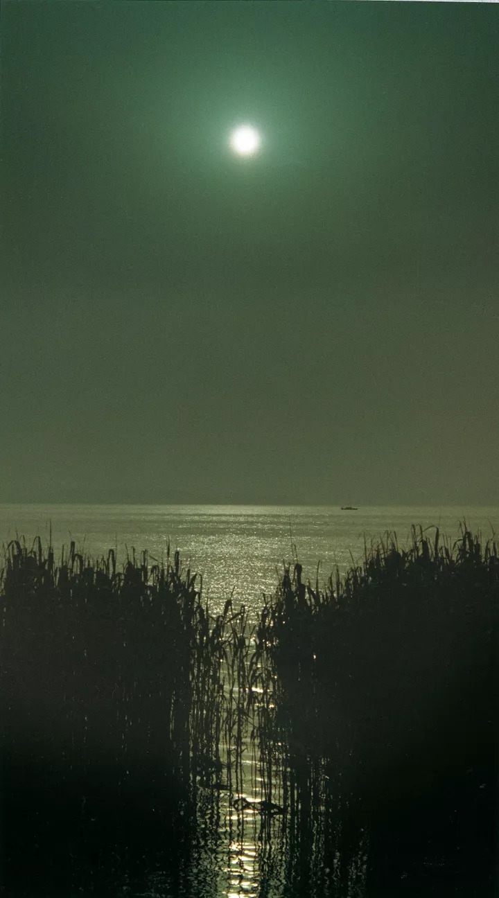 上午九十点钟,薄雾蔽日, 康泰克斯135相机、200毫米镜头, 加用深灰滤色镜片拍摄,在放大时又增加了密度, 使白昼变成了月夜,画面成“Y”字形, 上下左右平均分割,月亮被有意安排在正中位置。