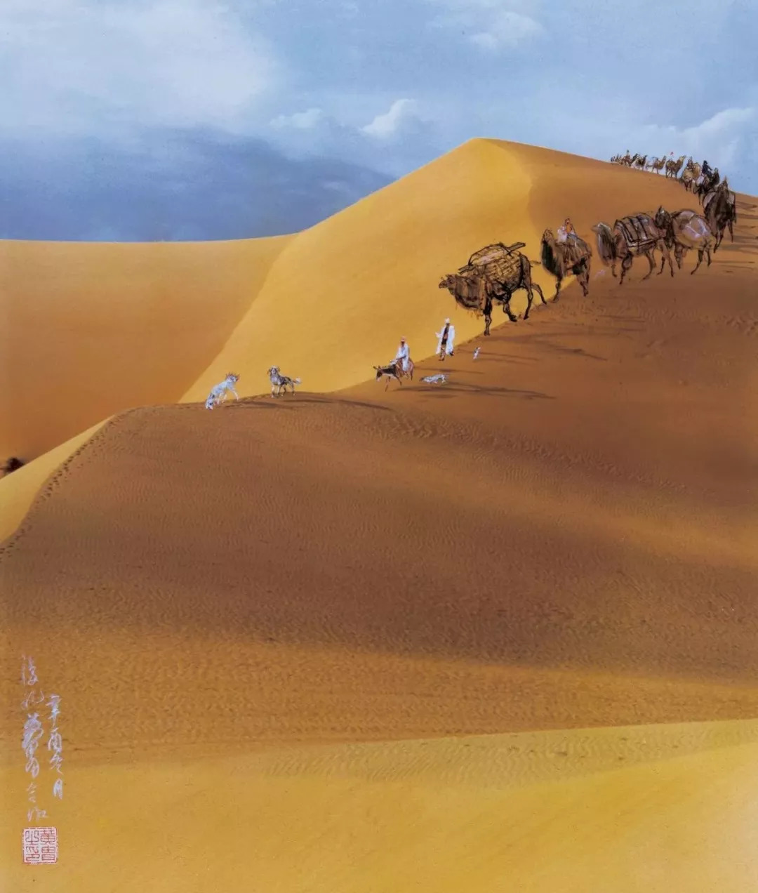 这是陈复礼拍摄的一幅浩瀚大漠, 擅长画动物的吴作人 在其中以笔墨轻点出一列驼队, 作品的意趣跃然而出,使人看后产生无限遐想。 这是昔日丝绸之路风情的生动写照。 ▼