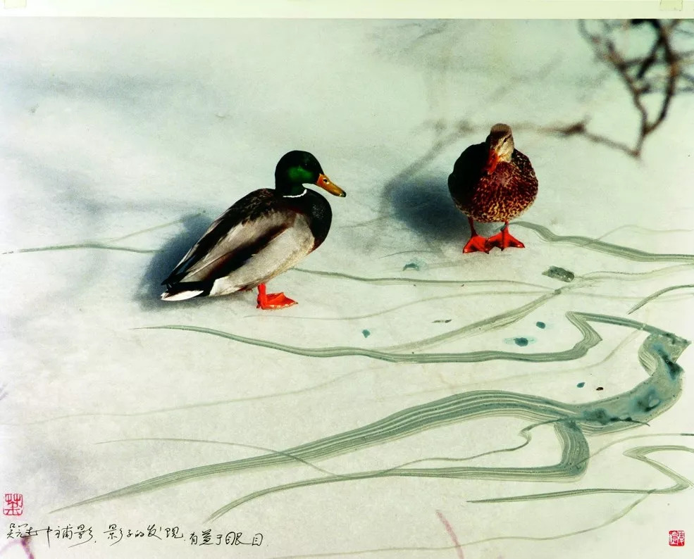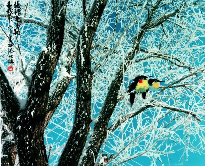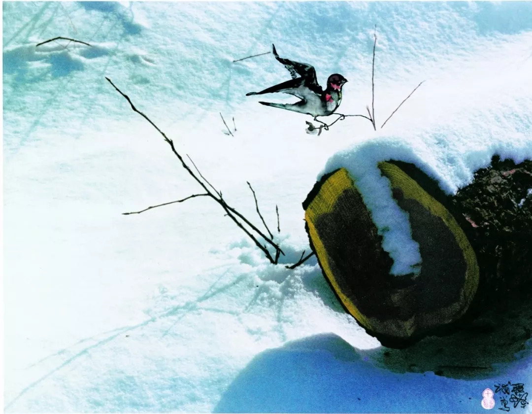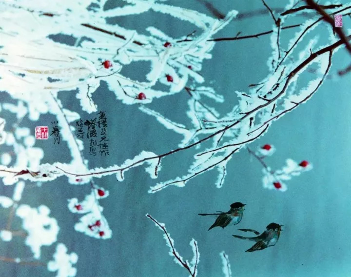 中国海派书画画家程十发巧妙地将小鸟点缀其间, 《雪地》《嬉雪》几乎鲜活了起来。 ▼