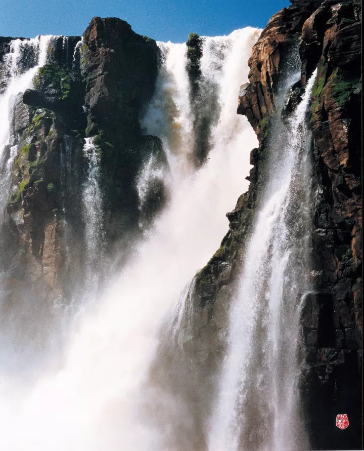 77岁 他乘坐30多个小时飞机 远赴南美巴西拍摄 为拍伊瓜苏瀑布的恢弘气势 乘橡皮艇摄影时 被巨浪冲击招致胫骨骨折 留下了这幅《裂胫之作》 ▼