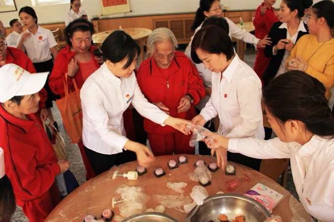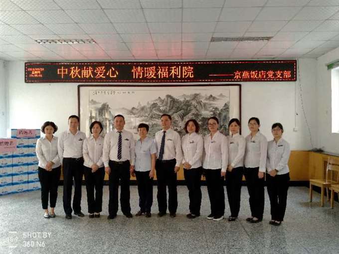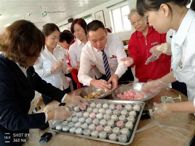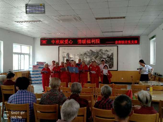 这边节目表演精彩继续,另一边,做月饼也在如火如荼地进行着。由京燕饭店党支部和福利院职工以及院里的老人组成的打月饼团队,不一会儿功夫已经做出了满满一大盒的月饼,由刘新副总和刘宇鹏副书记带领大家开始给在座的每一位老人派发月饼。饭店党员们表演了单口相声、口琴独奏、吉他演唱等节目,由福利院的老人组成的合唱团演唱了《我们住在福利院》和《志愿者和我们在一起》等歌曲。台下的老人们一边品尝着爱心人士亲手做的月饼,一边欣赏着大家精心准备的文艺节目,感动得热泪盈眶。最后,由京燕饭店全体党支部志愿者和福利院的老人代表一起演绎大合唱《没有共产党就没有新中国》,嘹亮的歌声在大厅里回荡,老人们幸福满足的笑容像盛开的鲜花般灿烂。