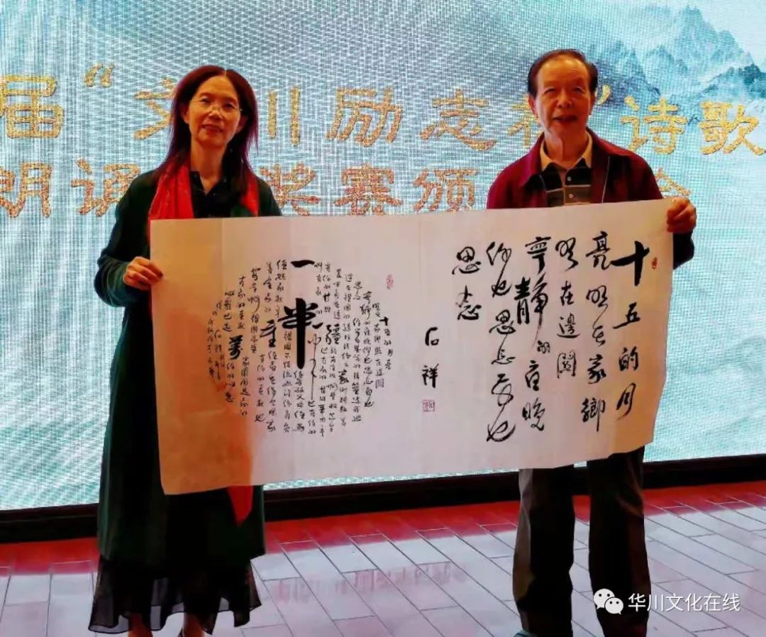 著名军旅诗人、歌词作家、书法家石祥先生,为大会致词并为资深媒体人琳雅女士赠送原创《十五的月亮》一幅作品