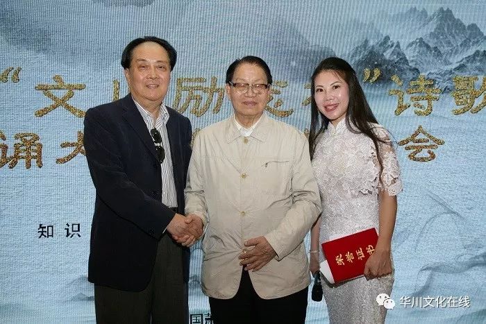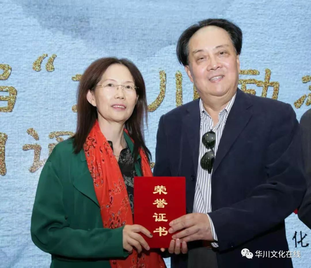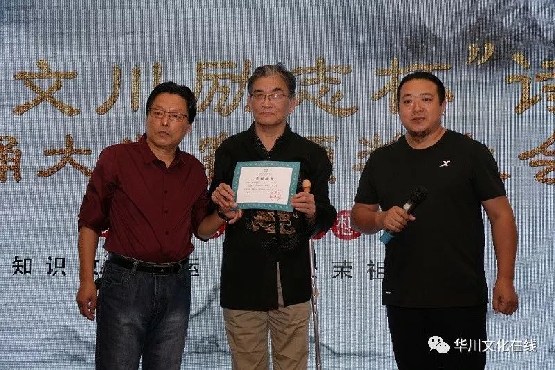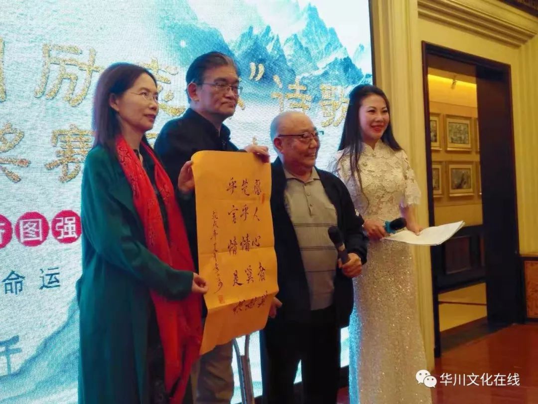 著名诗人绿岛、著名朗诵艺术家雪石为著名诗人文川颁发由国家图书馆收藏《文川哲理诗精选》书籍证书。