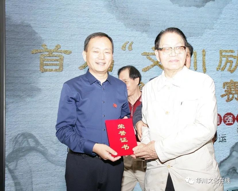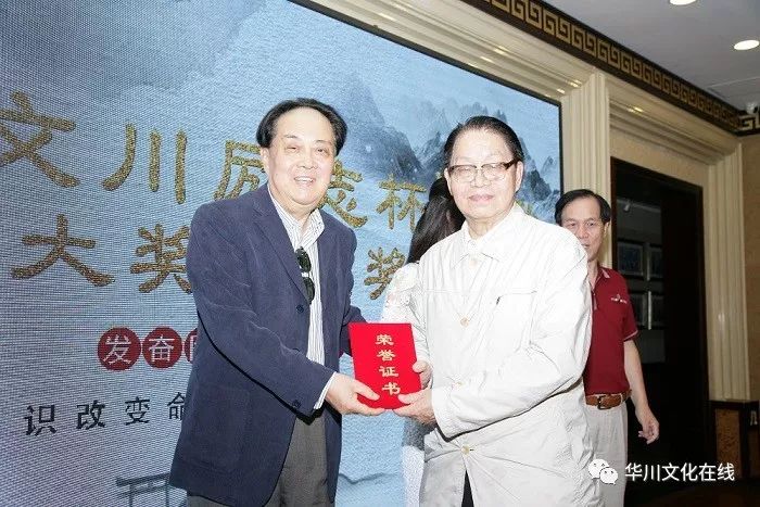 著名诗人徐再成、著名朗诵艺术家雪石为著名诗人文川颁发由首都图书馆收藏《文川哲理诗精选》书籍证书。