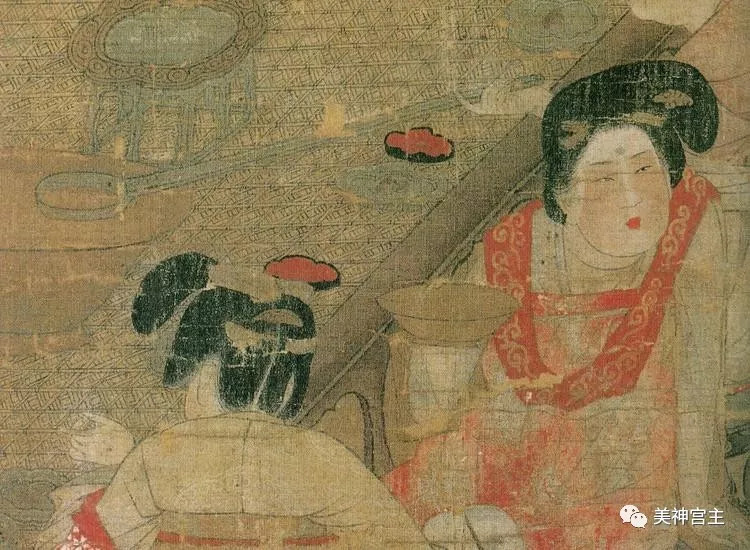 随着高足家具的发展,凳子的使用也多了起来。尤其是唐中期以后,垂足而坐的风气大盛,上至帝王将相,下至宫女歌伎,都开始坐椅凳之类的高型坐具。图中仕女所用坐具都是饰有很漂亮的带花纹、垂流苏的月牙形杌凳,也叫‘月牙杌子’。唐五代时期的桌案,与前代相比,已属高足家具,但和宋代以后的高型家具相比,还略低一些。从画上可以看出,这时的桌子,在高度上只是略高于凳子的坐面,大概和床榻面的高度齐平。这说明了家具在由低型向高型发展的过程中,有一个过渡阶段,这一阶段正处在唐五代时期。”