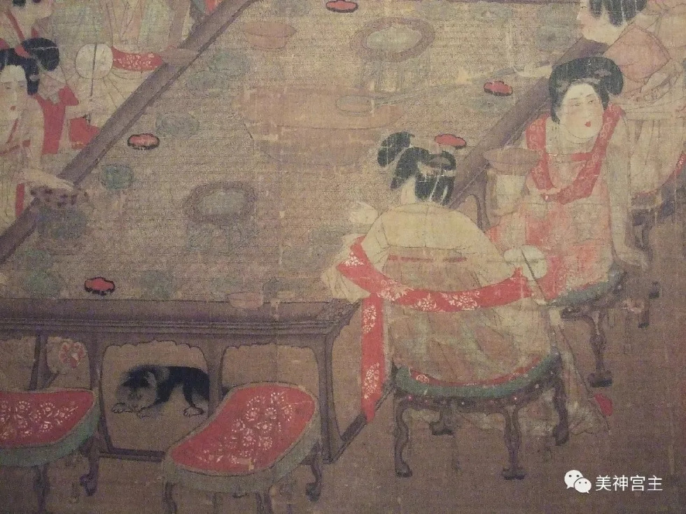 我转向楠方:“你对历史很有研究,接着说说?” 楠方抬起手,指着画说:“大家看这幅画的桌子和凳子。隋唐五代是我国室内陈设与家具形式大变革的时期。隋和唐代前期,传统席地而坐的起居习惯虽仍是主流,但使用高足家具与垂足而坐的风气已逐渐发展起来。到了盛唐,高足家具迅速推广,成为当时屋室家具的主要样型,垂足而坐的习俗初步形成。唐代中期以后,随着高型家具的普及,人们逐渐进入垂足而坐的时代,低型的几、案逐渐演变为后来的桌子和大型条案。使用高足桌案的习俗起源于唐代。画中这张可围坐12人的长案,四角有金属包角,均雕有金色花纹;案面漆以深绿色,上有白描花纹,四周重边都有装饰,四边出沿,下为蠹门结构,这是目前所见到的唐代最大型的案具。