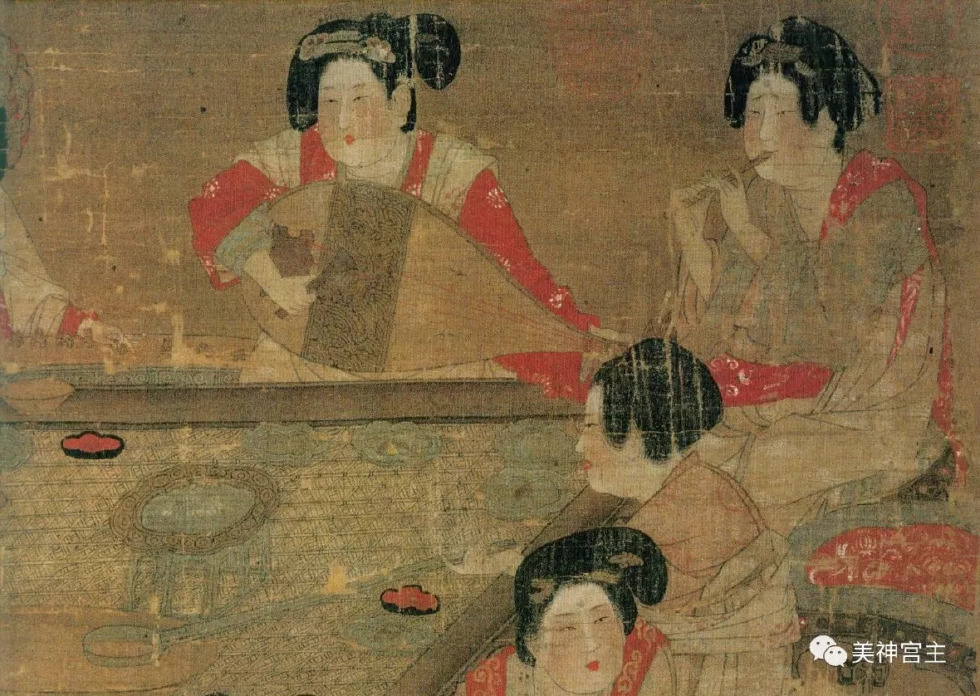 另外,现实主义的题材要求画家深入细致地观察生活,捕捉生活细节,目识心记,悉心体会,把自然形态上升为艺术形态进行再现。这种写实性极强的画作,留给后世的不仅是美的感受,也因为保留了各种物质文化的实物而具有文物价值的一面,像画中琵琶的形式与现在日本正苍院收藏的唐代琵琶十分相似,中段装饰所绘汹涌波涛与文献上记载的中晚唐琵琶上流行‘鱼龙转化’装饰的说法可以互为印证,还有弹奏者横持琵琶的拨法,也是一种古老的弹奏方法,与今天不一样。而其他的几案、椅凳、器血、服饰都可以作为这类视觉的文献资料供今天各学科的研究者使用。”