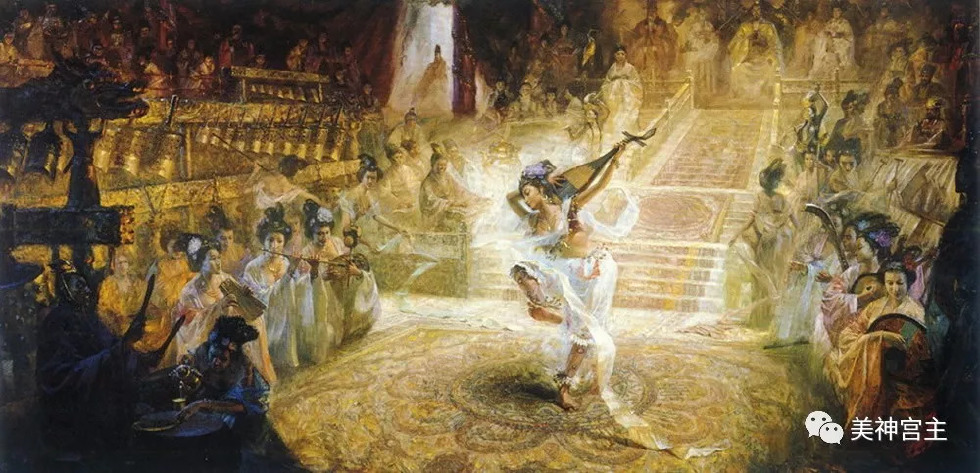 《韩熙载夜宴图》 薛先生对唐乐有独到的研究,林兴,你说说?” 我自谦一番后,说道:“大唐是艺术的黄金时代,各种艺术成就继往开来,彪炳千秋,是强大帝国沸腾生活的真实写照,并且强烈地焕发出这一伟大时代所特有的大胆变革、自信开放的心理特征和豪迈奔放、气势磅礴的创造激情。那些‘满壁风动’的人物画,洋溢出大唐上下意气风发、开拓进取的时代精神;‘金碧辉煌’的富丽山水,一展帝国江山的宏伟壮观和豪迈气概;宗教壁画不再是‘苦难的呻吟’,而是美满幸福的西方‘极乐世界’;‘山是一座佛,佛是一座山’的乐山大佛,是唐代雕塑艺术的一大奇迹;浓艳明丽、万千情状的三彩陶俑,驰名中外;颜柳的法书和颠张狂素的草书,被视为稀世珍宝……