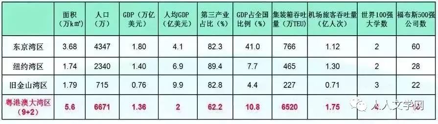 (粤港澳大湾区概况) 粤港澳大湾区用不足1%的国土面积,不足5%的人口总量,创造了国内生产总值的11%。 与世界其他三大湾区对比,粤港澳大湾区在人口、面积、港口吞吐量、旅客吞吐量、GDP增速等几个指标上,排名第一;经济总量,也已超过旧金山湾区,接近纽约湾区。