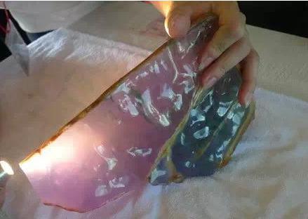 这件翡翠毛料,在强光电筒的照射下,艳丽亮润,冰种,春(紫罗兰)色,飘有绿花,缅甸人把此类春色叫“桃花春”,“桃花春”底净无棉无裂,美轮美奂。