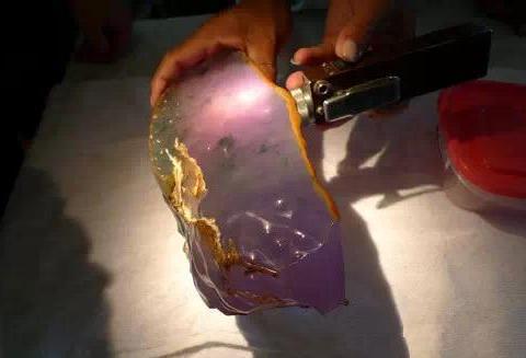 而现在由于翡翠毛料短缺,价格疯涨,这款料目前保守估价,市值至少10亿人民币。 这块原料重6公斤,玻璃种紫罗兰色飘绿花,非常特别,史上从未见过。