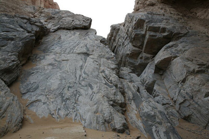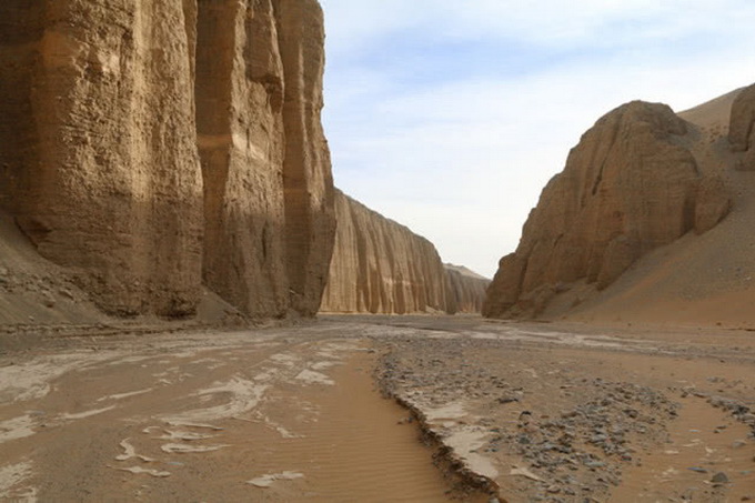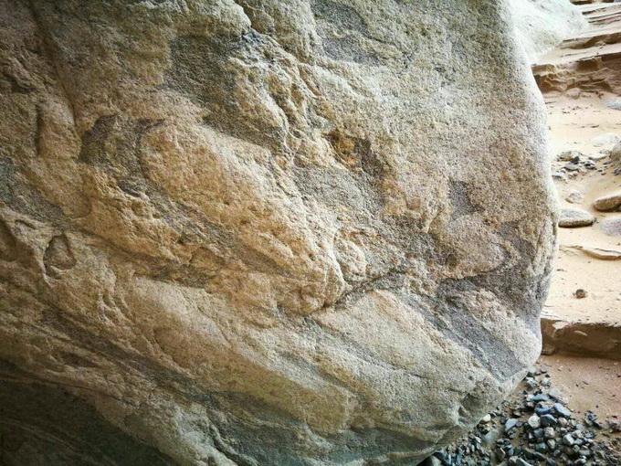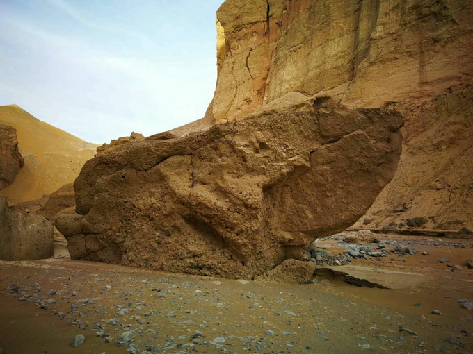不知翻越了多少沙丘,终于到了一条峡谷的沟口,沿着这条古河床纵深还有65公里。在这里每走一公里都是非常艰难的,我们用了2个多小时的时间终于到达了峡谷的谷底。