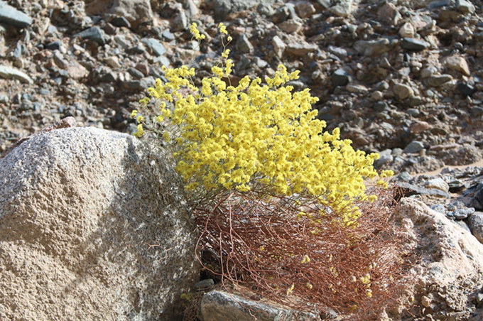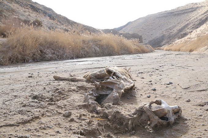 峡谷里延绵数公里自然形成的小溪旁有浓密的植被,这是野骆驼的食粮。夏季沙漠上酷热难耐,野骆驼便在这条沟里乘凉,有潺潺的流水滋养着它们的生命。冬天小溪还没有结冰,野骆驼可以在这里自由的饮水撒欢。