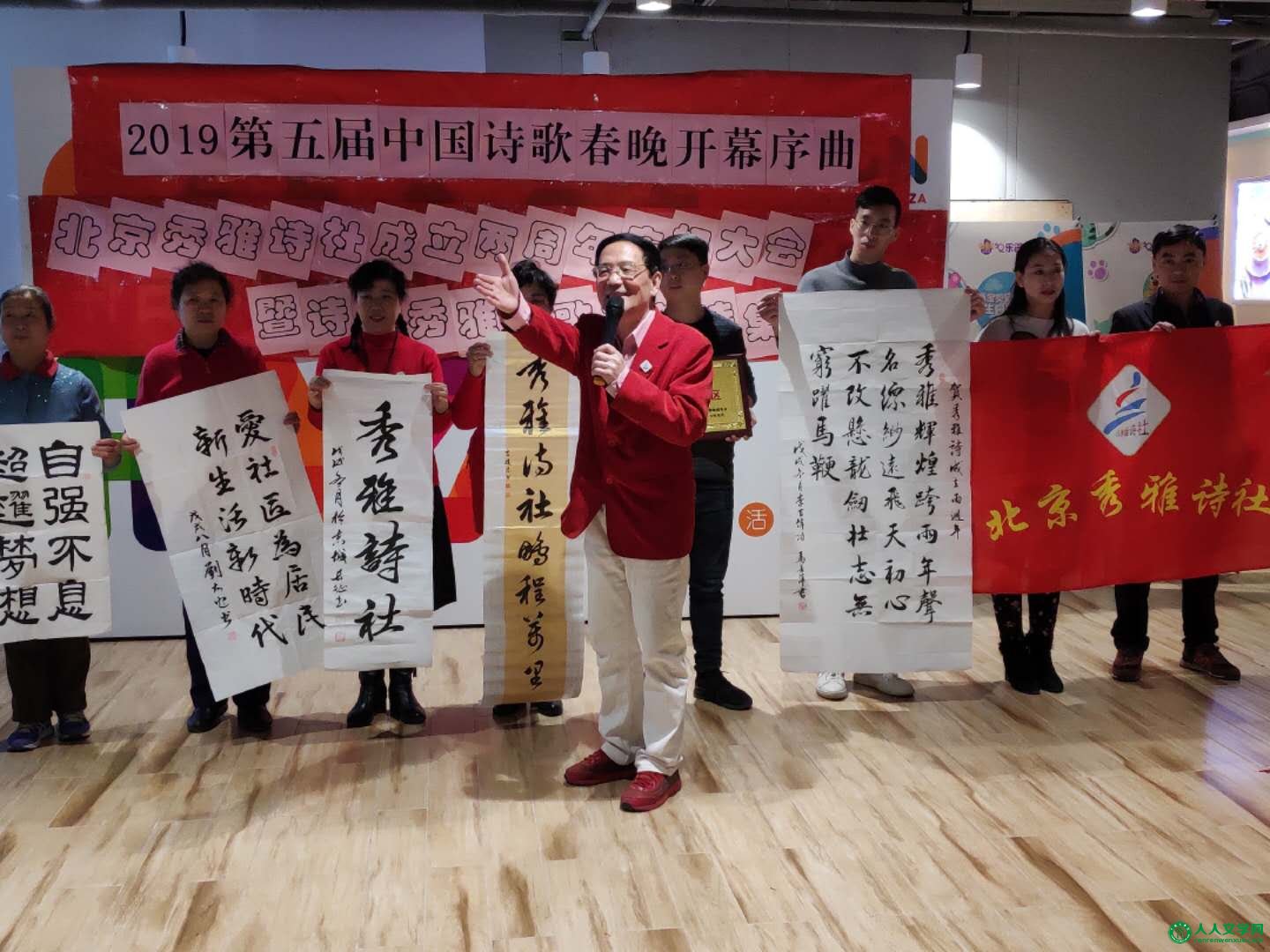 2019年1月18日上午北京太阳飘亮购物中心一楼一派节日景象,喜气洋洋。2019第五届中国诗歌春晚开幕序曲——北京秀雅诗社成立两周年暨《诗意秀雅诗歌千首》首发式在这里隆重举行,北京秀雅诗社社长盛万山主持。