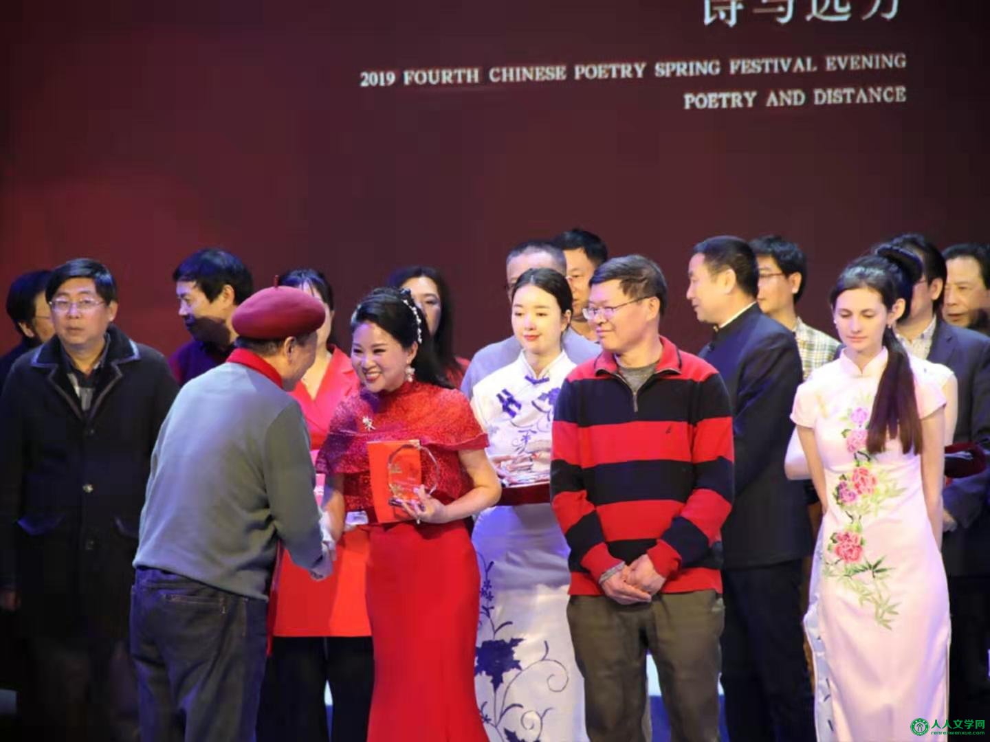 在华语诗歌春晚颁奖环节,诗人刘雅阁被本届华语诗歌春晚组委会授予“2019年华语诗歌春晚公益推广大使”荣誉称号,并向她颁发了大使证书和奖杯。