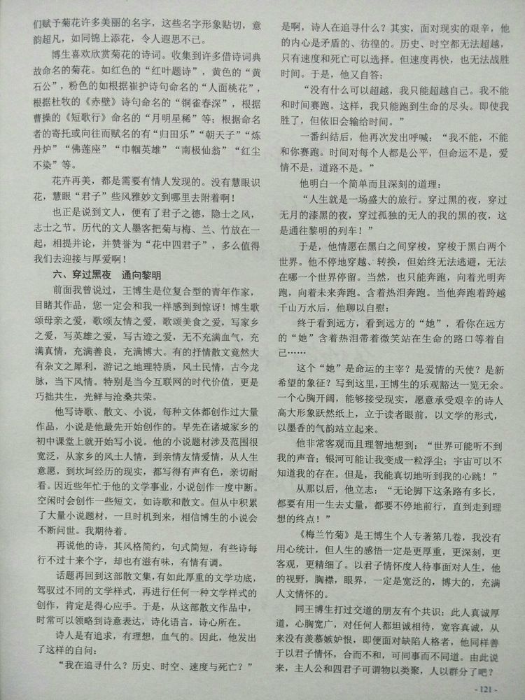 前面我曾说过,王博生是位复合型的青年作家,目睹其作品,您一定会和我一样感到到惊讶!博生爱歌颂母亲之爱,歌颂友情之爱,歌颂美食之有,写家乡之爱,写英雄之爱,写古迹之爱,无不充满血气,充满真情,充满善良,充满博大。 有的抒情散文竟然大有杂文之犀利,游记之地理特质,风土民情,古今龙脉,当下风情。特别是当今互联网的时代价值,更是巧拙共生,光鲜与沧桑共荣。 他写诗歌散文小说,每种文体都创作过大量作品。小说是他最先开始创作的。早先在诸城家乡的初中课堂上就开始写小说,阅读小说。以至于数学和英语考试都不极格。他的小说题材涉及范围也很宽泛,从家乡的水土人情,到亲情友情爱情,从人生意愿,到坎坷经历的现实,都写得有声有色,亲切耐看。因近些年忙于他的文学事业,小说创作一度中断。空间时会创作一些短文,如诗歌和散文。但从中积累了大量小说题材,一旦时机到来,相信博生的小说会不断问世。我敬重期待。 再说他的诗,其风格简约,句式简短,有些诗每行不过十来个字,却也有滋有味,有情有调。 话题再说回到这部散文集,有如此厚重的文学功底,驾驭过不同的文学样式,再进行任何一种文学样式的创作,肯定是得心应手。于是,从这部散文作品中,时常可以领略到诗意表达,诗化语言,诗心所在。 诗人是有追求,有理想,血气的。因此,他发出了这样的自问: “我在追寻什么?历史、时空、速度与死亡?”是啊,诗人在追寻什么?其实,面对现实的艰辛,他的内心是矛盾的,彷徨的。历史、时空都无法超越,只有速度和死亡可以选择。但速度再快,也无法战胜时间。于是,他又自答: “没有什么可以超越,我只能超越自己。我不能和时间赛跑。这样,我只能跑到生命的尽头。即使我胜了,但依旧会输给时间。” 一番纠结后,他再次发出呼喊:“我不能,不能和你赛跑。时间对每个人都是公平,但命运不是,爱情不是。道路不是。” 他明白一个简单而且深刻的道理: “人生就是一场盛大的旅行。穿过黑的夜,穿过无月的漆黑的夜,穿过孤独的无人的我的黑的夜。这是通往黎明的列车!” 于是,他情愿在黑白之间穿梭,穿梭于黑白两个世界。他不停地穿越、转换,但始终无法逃避,无法在哪一个世界停留。当然,也只能奔跑,向着光明奔跑,向着未来奔跑。含着热泪奔跑。当他奔跑着跨越千山万水后,他聊以自慰: 终于看到远方,看到远方的“她”,看你在远方的“她”含着热泪带着微笑站在生命的路口等首自己…… 这个“她”是命运的主宰?是爱情的天使?是新希望的象征?! 写到这里,王博生的乐观豁达一览无余。一个心胸开阔,能够接受现实,愿意承受艰辛的诗人高大形象跃然纸上,立于读者眼前,以文学的形式,以墨香的气韵站立起来。 他非常客观而且理智地想到: “世界可能听不到我的声音;银河可能我变成一粒浮尘;宇宙可以不知道我的存在。但是,我能真切地听到我的心跳!” 从那以后,他立志: “无论脚下这条路有多长,他都要有用一生去丈量,都要不停地前行,直到走到理想的终点?!” 《梅兰竹菊》是王博生个人专著第几卷,我没有用心统计,但人生的感悟一定是更厚重,更深刻,更客观,更精细了。以君子情怀度人待事面对人生,他的视野,胸襟,眼界,一定是宽泛的,博大的,充满人文情怀的。 同王博生打过交道的朋友无疑有个共识:此人真诚厚道,心胸宽广,对任何人都坦诚相待,宽容真诚,从来没有羡慕嫉嫉妒恨,即便面对缺陷人格者,他同样善于以书君子情怀盛装,合而不和,可同事而不同道。由此说来,主人公和四君子可谓物以类聚,人以群分了吧? 谨以此送王博生兄弟。再致散文集问世的祝贺之情!