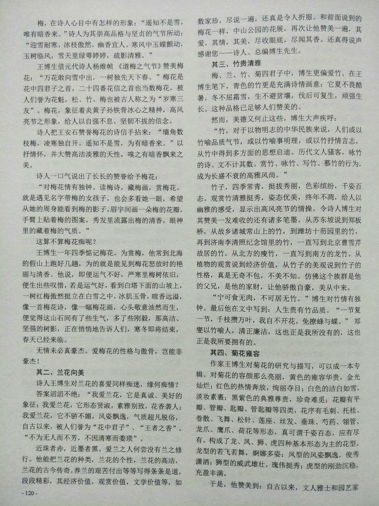 其一、梅花骨傲 博生先生散文集既然名为《梅兰竹菊》,这四君子便是其文眼了。文如其人,君子同道。 梅,在诗人心目中有怎样的形象:“遥知不是雪,唯有暗香来”。诗人为其崇高品格与坚贞的气节所动: “迎雪耐寒,冰枝傲然,幽香宜人。寒风中玉蝶颤动,玉树临风,雪天里绿萼婷婷,疏影清雅。” 王博生借元代诗人杨维帧 《道梅之气节》赞美梅花:“万花敢向雪中出,一树独先天下春。”梅花是花中四君子之首,二十四番花信之首也当数梅花,被人们誉为花魁,松、竹、梅也被古人称之为“岁寒三友”。梅花,象征着炎黄子孙铁骨冰心之精神,高风亮节之形象,给人以自强不息、坚韧不拔的信念。 诗人把王安石赞誉梅花的诗信手拈来:“墙角数枝梅,凌寒独自开。遥知不是雪,为有暗香来。”以抒情怀,并大赞高洁淡雅的天性,嗅之有暗香飘来之美。 诗人一口气说出了长长的赞誉给予梅花: “对梅花情有独钟。读梅诗,藏梅画,赏梅花。就是遇见名子带梅的女孩子,也会多看她一眼,希望从她的周身能看到梅的影子,眉宇间画一朵梅的花瓣,手臂上贴着梅的图案,秀发里流露出梅的清香,眼神里的藏着梅的气质。” 这算不算梅花痴呢?! 王博生一年四季惦记梅花。为赏梅,他常到北海的假山上跑好几趟,为的就是能见到梅花怒放时的艳丽与清香。他说,即便运气不好,严寒里梅树依旧,便生出些叹惜,若是运气好,看到白塔下面的山坡上,一树红梅傲然挺立在白雪之中,冰肌玉骨,暄香远溢,像一首梅花诗,像一幅梅花画,心头敬意由然而生,便觉得这山石间有了些生气,多了些刚毅,那高洁、坚强的树影,正在悄悄地告诉人们,寒冬即将结束,春天已经来临。 无情未必真豪杰。爱梅花的性格与傲骨,岂能非豪杰! 其二、兰花向美 诗人王博生爱对兰花的喜爱同样痴迷,缘何痴情? 答案滔滔不绝: “我爱兰花,它是真诚、美好的象征;我爱兰花,它形态贤淑,素雅别致,花香袭人;我爱兰花,它不骄不媚,风姿飘逸,气质超凡脱俗,自古以来,被人们誉为“花中君子”、“王者之香”。“不为无人而不芳,不因清寒而委琐”。 近珠者赤,近墨者黑。爱兰之人何尝没有兰之修行。他能把兰花的种类,兰花的个性,兰花的高洁,兰花的古今传奇,养兰的艰苦付出等等写得条条是道,段段精彩,其经济价值,观赏价值,文学价值等,如数家珍,尽说一遍。还真是令人折服。和前面说到的梅花一样,中山公园的花展,再次让他赞美一遍,其爱,其情,其美,尽收眼底,尽闻其香。还真得说声感谢您——诗人、总编博生先生。 其三、竹贵清淅 梅、兰、竹、菊四君子中,博生更偏爱竹。在王博生笔下,青色的竹更是充满诗情画意:它夏不畏酷暑,冬不屈霜雪,生不避贫壤,伐后可复生顽强生长。这种品格已足够人们赞美的。 然而,美德又何止这些。博生大声疾呼: “竹,对于以物明志的中华民族来说,人们或以竹喻品质气节,或以竹喻事明理,或以竹抒情言志,从竹中得到多方面的思想启迪。历代文人骚客,咏竹的诗、文不计其数。赏竹、咏竹、写竹、慕竹的行为,成为长盛不衰的高雅风尚。 竹子,四季常青,挺拔秀丽,色彩缤纷,千姿百态。观赏竹清雅挺秀,姿态优美,终年不凋,给人以幽雅的感受,显示出高风亮节的情操。令诗人博生对其赞美一发难收的还有诸多笔墨。从苏东坡说到郑板桥,从故乡诸城常山上的竹,到潍坊十芴园里的竹,再到济南李清照纪念馆里的竹,一直写到北京曹雪芹故居的竹。从北方的瘦竹,一直写到南方的龙竹。从植物的观赏说到经济价值,从竹子的美观说到竹子的性格,真是无奇不包,不美不知。仿佛这个族群是他的父兄,是他的家财,让他骄傲自豪,美从中来。 “宁可食无肉,不可居无竹。”博生对竹情有独钟。最后他在文中写到:人生贵有竹品质。“一节复一节,千枝攒万叶,我自不开花,免撩蜂与蝶。” 郑燮以竹喻人,清正廉洁,这也正是我所没有的,这也正是我所要拥有的。 其四、菊花雍容 作家王博生对菊花的研究与描写,可以成一本专辑。对菊花的容颜那么亮丽,黄色的雍容华贵,金光灿烂;红色的热情奔放,绚丽夺目;白色的洁白如雪,淡妆素裹;黑紫色的典雅尊贵,珍奇难觅;花瓣有平瓣、管瓣、匙瓣、管匙瓣等四类,花序有毛刺、托桂、卷散、飞舞、松针、莲座、丝发、垂珠、芍药、翎管、龙爪、鹰爪、荷花等形态,真可谓千姿百态,应有尽有。构成了龙、凤、狮、虎四种基本形态为主的花型。龙型的若飞若舞,婀娜多姿;凤型的风姿飘逸,俊秀潇洒;狮型的威武雄壮,瑰伟挺秀;虎型的刚劲沉稳,充盈丰满。 于是,他赞美到: 自古以来,文人雅士和园艺家们赋予菊花许多美丽的名子,这些名子形象贴切,意韵超凡,如同锦上添花,令人遐思不已。” 博生喜欢欣赏菊花的诗词。收集到许多借诗词典故命名的菊花。如红色的“红叶题诗”,黄色的“黄石公”,粉色的如根据崔护诗句命名的“人面桃花”,根据杜牧的《赤壁》诗句命名的“铜雀春深”,根据曹操的《短歌行》命名的“月明星稀”等;根据命名者的寄托或向往而赋名的有“归田乐”、“朝天子”、“炼丹炉”、“佛莲座”、“巾帼英雄”、“南极仙翁”、“红尘不染”等。 花卉再美,都是需要有情人发现的。没有慧眼识花,慧眼“君子”些风雅妙文到哪里去附着啊! 也正是说到文人,便有了君子之德,隐士之风,志士之节。历代的文人墨客把她与梅、兰、竹放在一起,相提并