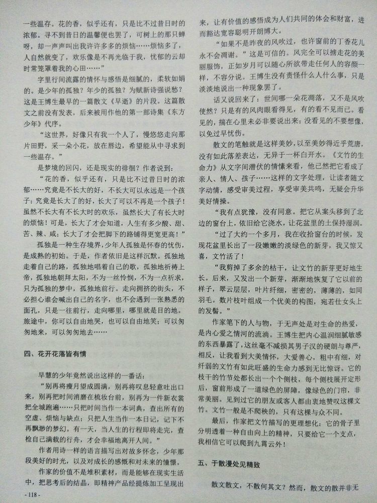 早慧的少年竟然说出这样的番话: “别再将瘦月望成圆满,别再将叹息轻意吐出口来,别再把时间消磨在梳妆台前,别再为一件新衣裳把全城跑遍……只把时间当作一本词典,查出所有的空虚、烦恼与缺点;只把人生当作一本日记,记下不再飘渺的梦幻。有一天,当人生的行程即将走完,查检自己满载的行舟,才会幸福地离开人间。” 作者用诗一样的语言描写出对故乡怀念,少年那段美好的时光。以及对成长的感慨和对未来的憧憬。 作家的价值不是是堆积素材,而是能够在现实生活中,把思考后的结晶,即精神产品经提炼加工呈现出来,让有价值的感悟成为人们共同的体会和财富,进而豁达宽容聪明开朗博大。 “如果不是昨夜的风吹过,也许窗前的丁香花儿永不会凋谢。”这是可信的。风完全可以掳走花的美丽服饰,正如岁月可以随心所欲望带走任何人的容颜一样,不容分说。王博生没有责怪什么人什么事,只是淡淡地说出一种现场罢了。 话又说回来了:世间哪一朵花凋落,又不是风吹使然?只是有的风肉眼看得见,有的看不见而已。看见的,揣在心里未必非要说出来;没看见的不要想像,以免过早忧伤。 散文的笔触就是这样美妙以至美妙得近乎荒唐,没有如此落差表达,无异于一杯白开水。 像王博生这样心中满是悲悯,眼中满是生命,岂能没这生死未卜的文竹失去信念和挽救之情。《文竹的生命力》从文字间潜伏的情愫来看,他已然把它看成了亲人、情人、孩子……这样的文字处理,让读者随文字动情,感受审美过程,享受审美共鸣,无疑会升华美好情操。 “我有点犹豫,没有同意。把它从案头移到了北边的窗台上,依旧给它浇水,让花盆里的土保持湿润。 “过了大约一个多月,我在收拾窗台的时候,发现花盆里长出了一段嫩嫩的淡绿色的新芽,我又惊又喜,文竹活了! “我剪掉了多余的枯干,让文竹的新芽更好地生长。后来,又发出一个新芽,渐渐地回复了它以前的样子,翠云层层,叶片纤细,密密的,薄薄的,如同羽毛。数片枝叶组成一个优美的构图,宛若仕女头上的发髻。” 作家笔下的人与物,于无声处是对生命的热爱,是内心爱之情河的流淌。王博生把内心温润细腻敏感的东西暴露了,这丝毫不减损其男子汉的硬朗与尊严,相反,让我看到大美情怀,大爱善心,粗中有细,对纤弱的文竹有如此旺盛的生命力感到无比惊讶。它的枝干的竹节处都长出一个个侧枝,每个侧枝展开定形后,窗前形成了一道绿色的屏障,像绿色的门帘,非常美丽。见到过它的朋友或客人都由衷地赞叹这棵文竹。文竹一般是不爬秧的,只有这棵与众不同。 最后,作家把文竹描写的更理想化:它的骨子里分明透着一种自由向上的精神,只要给它一个支点,我相信它可以爬到九霄云外!