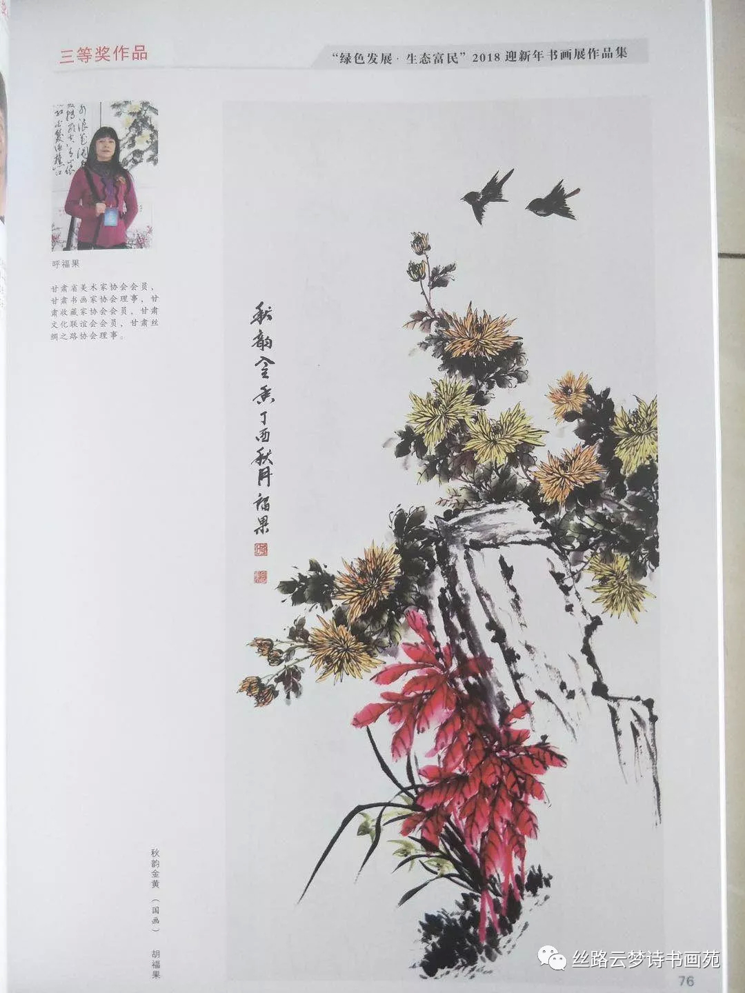 呼福果简介 姓 名:呼福果 常 驻 地:甘肃·兰州 现 任: 甘肃省美术家协会会员 甘肃书画家协会理事 甘肃博渊书画院院士 兰州文化联谊会会员 甘肃毛泽东书法艺术研究院院士 甘肃毛泽东书法艺术研究院润博分院副秘书长 中国书画研究院研究员 甘肃丝绸之路协会理事 省老干部书画协会理事 兰州市老年书画协会会员 呼福果女士艺术履历 2013年美术作品入展由甘肃省美术家协会、甘肃省摄影家协会、甘肃省民间文艺家协会、甘肃收藏家协会、甘肃收藏家协会文房四宝艺术委员会联合举办的《第四届甘肃省百名艺术家作品展览》; 2013年绘画作品入展甘肃书画家协会举办的《甘肃当代书画家艺术典库》第三卷发行式暨全省小幅书画精品展,; 2014年5月纪念毛泽东《沁园春·雪》发表69周年书画展获二等奖; 2014年10月参加甘肃丝绸之路协会第三届书画赛获优秀奖; 2014年11月飞天学会成立35周年书画展览获优秀奖。 2015年8月,在爱中华爱和平“亨威杯”海峡两岸书画邀请展中,美术作品“秋韵荷花國画”获得港台华人三等奖。 2015年9月,作品入展纪念中国人民抗日战争暨世界反法西斯战争胜利70周年《黄河流域》九省区老干部书画联展作品集。 2015年9月,在第四届丝绸之路“名仕杯”名家书画大展获得优秀奖。 2015年9月在中国梦、科技梦,甘肃省第五届科技界书画摄影展,获得二等奖。 2017年7月被推选为全国最有影响力优秀艺术家候选人。 2017年7月被中国观网推展为一带一路西部书画影响力人物。 2017年8月兰州军区善后办纪念建军90周年书画展获三等奖。 2017年9月入展全国书画大赛“纪念秋收起义九十周年”达意堂杯作品展览。 2017年11月获得兰州市城关区纪念爱国卫生运动65周年书画摄影大赛绘画组一等奖。 2017年12月在由甘肃省文联、甘肃省三农问题研究会举办的“绿色发展生态富民”迎新书画展中获三等奖。 2017年12月获得由中国观网举办的网民首选西部书画大家影响力人物。 2018年9月17号荣获“魅力中国 闪耀世界-世界邮票上的中国文化”巴黎展。 2018年12月26日作品入选“纪念毛泽东同志诞辰125周年中国梦•相约韶山”全国书画名家作品邀请展。 2018年12月13日参加由甘肃省体育文华发展促进会国家体育总局中国奥委会主办2018年中国体育文化博览会优秀作品 “葡萄”获优秀奖。 2019年1月20号被中国书画春节联欢晚会栏目组评为“中国•甘肃•兰州十佳书画家”。