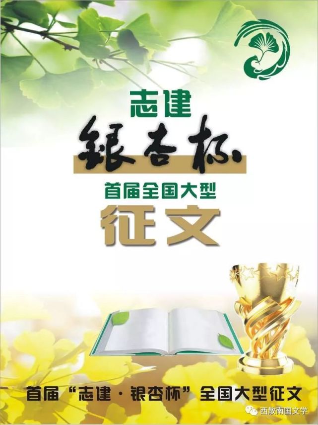 请输入图片描述 为了促进银杏产业的长足进步,为企业注入文化力量,西部散文学会、汉中赤土岭文化交流协、西散南国文学社与陕西省洋县志建药业科技有限公司共同举办首届“志建银杏杯”全国大型征文大赛,望有志之士踊跃投稿参与。 二、主办单位: 汉中市银杏产业协会 中国西部散文学会 汉中市赤土岭文化交流协会 西散南国文学社 三、承办单位: 陕西洋县志建药业科技有限公司 陕西省汉中市赤土岭文化传播有限公司 四、协办单位: 汉中日报 西部散文选刊 五、体裁要求: 散文、诗歌、报告文学、小说等体裁不限。散文3000字以内,报告文学及短篇小说不超过4000字,诗歌50行以内,组诗不超过200行。来稿请注明“首届志建银杏杯”征文字样,作品必须原创首发,不得一稿多投,文责自负,同时附带作者简介、联系地址、电话、生活照片一张。 征文投稿邮箱: 西散南国文学投稿邮箱: 2155074933@qq.com 赤土岭文协投稿邮箱:276384844@qq.com 中国西部散文选刊投稿邮箱:xibusanwenxuankan@163.com 六、选稿要求: 以“旅游.文化.健康”为主线,以挖掘银杏文化为核心,内容不涉及敏感话题,文本情感真挚,有一定思想和生活体验,有美感和意境,语言干净有味。 七、奖项设置 1、一等奖3名(小说、散文、诗歌各一名):奖金6000元,现金2000元,银杏系列产品(价值肆仟元),颁发荣誉证书; 2、二等奖6名(小说、散文、诗歌各两名):奖金3000元,现金1000元,银杏系列产品(价值贰仟元),颁发荣誉证书; 3、三等奖10名:奖金1000元,现金500元,银杏系列产品(价值伍佰元),颁发荣誉证书; 4、优秀奖20名,银杏系列产品(价值伍佰元)颁发荣誉证书。 凡获奖作品均结集出版,届时还将举办第十三届西部散文节暨征文大赛颁奖典礼,整个征文获奖作品及相关活动,将在陕西省各大报刊、媒体及网络发布。 八、本次征文截止时间:2019年8月31日。 九、投稿的同时请添加负责人微信(联系电话与微信同步13889088388) 十、特别提示: 为扩大本次征文影响力,鼓励作者宣传推介自己的作品。入围作品,由一审部门匿名、编号,交终审部门,最终由知名作家(评委名单另行公布)组成的评审委员会,以质量作为唯一奖项的评定标准。