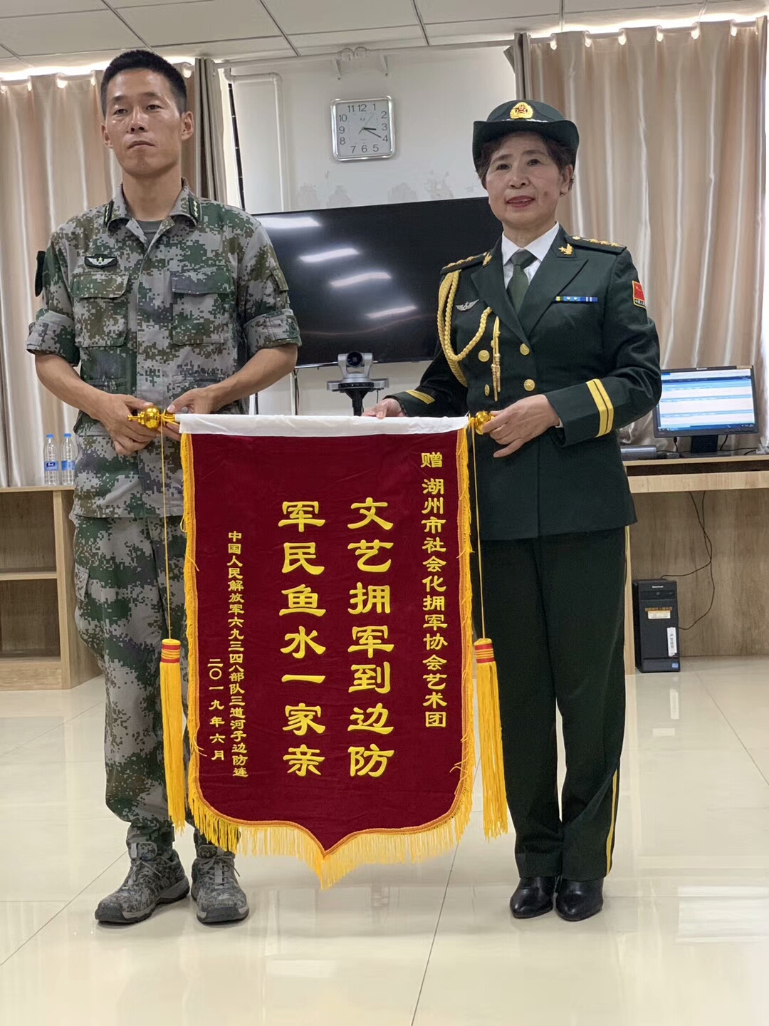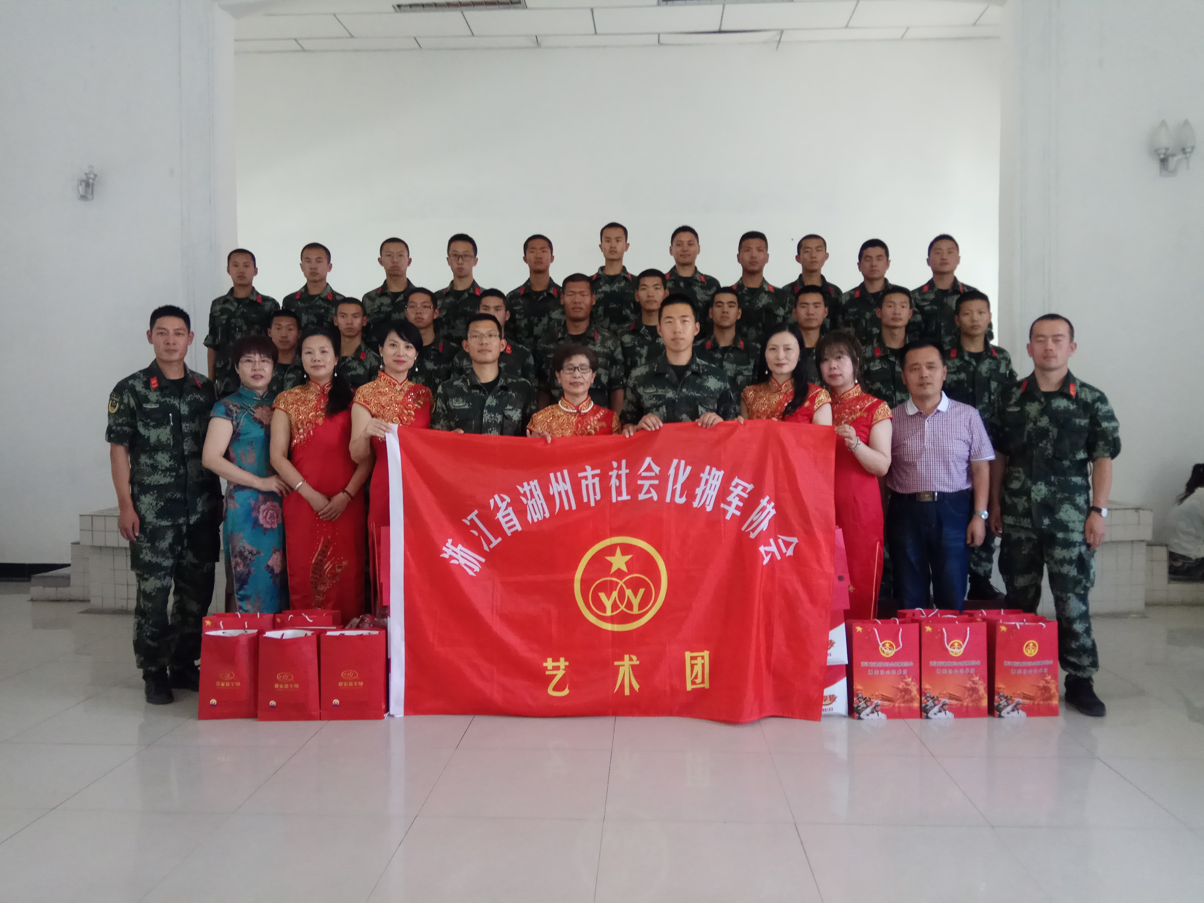 湖州市拥军协会艺术团为部队官兵赠送旌旗合影留念