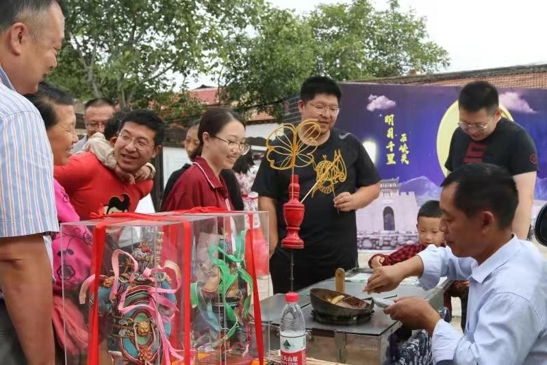 中秋节当天夜里,八达岭镇石峡村灯火通明,身着各式古装的村民、游人行走其中,仿佛穿越到古代闹市。现场设置的嫦娥奔月、吴刚伐桂、放灯祈福等打卡标志,现场提供嫦娥、吴刚服装,LED灯等道具,让游客了解中秋故事,体验中秋民俗,还可以融入场景中拍照,留下美好回忆。活动现场多位延庆传统手工艺人,现场表演豆塑、羽毛画、烙画、毛猴等多种手工技艺和非遗作品。