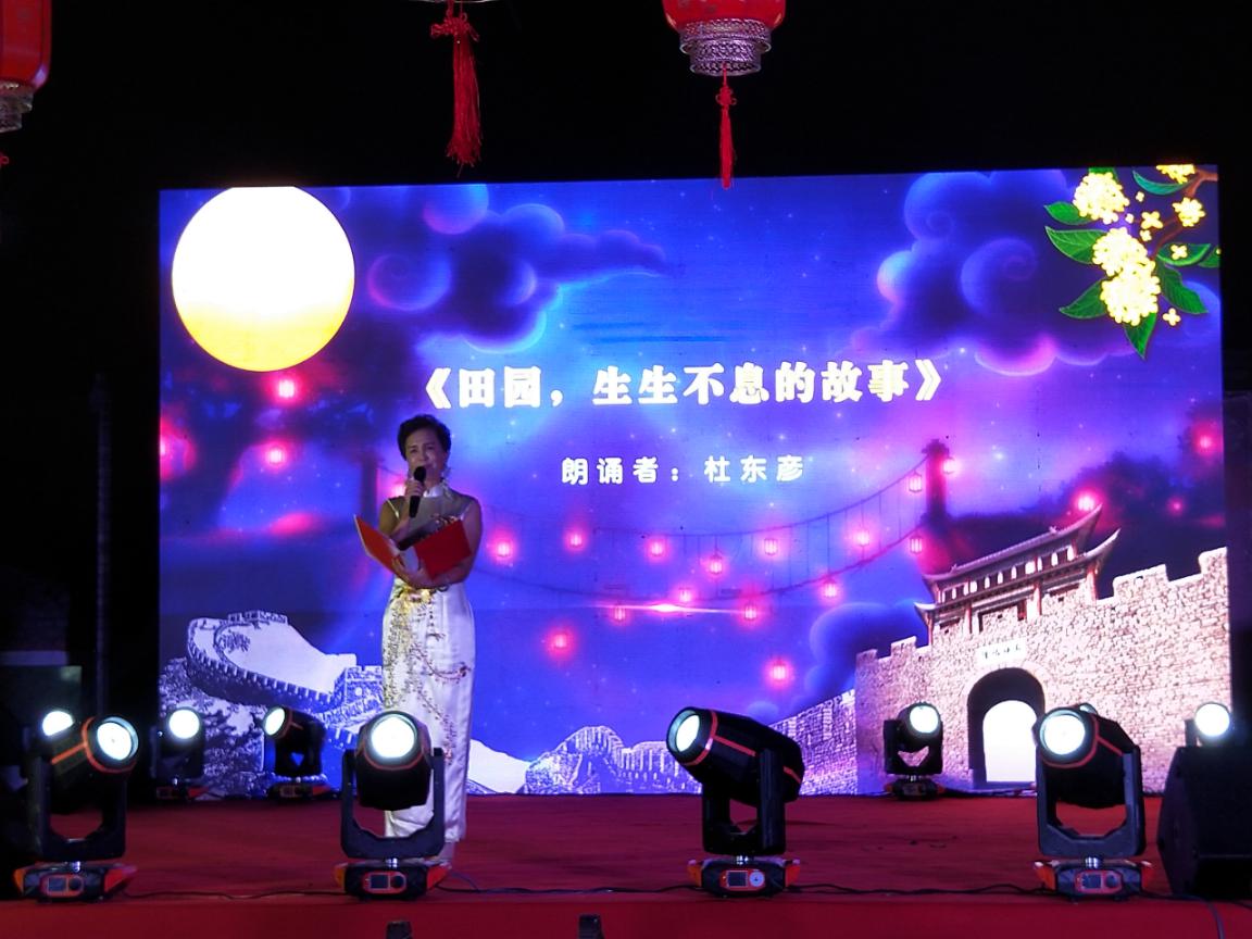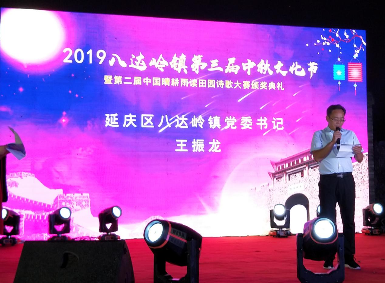 中国农业科学院党组成员、纪检组长、朗诵(表演)俱乐部主席李杰人、八达岭镇党委书记王振龙等领导在晚会现场发表了热情洋溢的讲话。李杰人向获奖作者表示了祝贺,并感谢延庆区八达岭镇政府举办的中秋文化节活动,感谢共同襄办这次田园诗歌大赛的各方力量。李杰人表示,建设美丽乡村,传承农耕文化,留住青山绿水,记住美好乡愁,需要各方共同努力、共同建设。中国农业科学院及其运行的国家农业图书馆愿与大家一起,共同投入乡村振兴的伟大事业中,贡献科技的力量、贡献文化的力量。