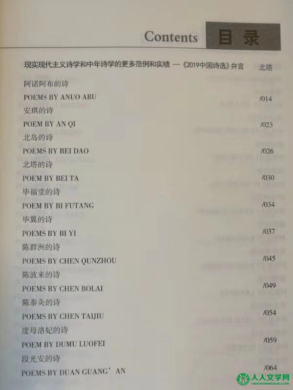 《中国诗选2019(汉英双语版)》 出版发行 本网讯,《中国诗选2019(汉英双语版)》于2019年9月由上海文艺出版社出版。 该诗集收录了69人132首作品。用北塔在序中的话来说,此集展示了现实现代主义诗学和中年诗学的更多范例和实绩。 该诗集由北塔、龚璇主编。