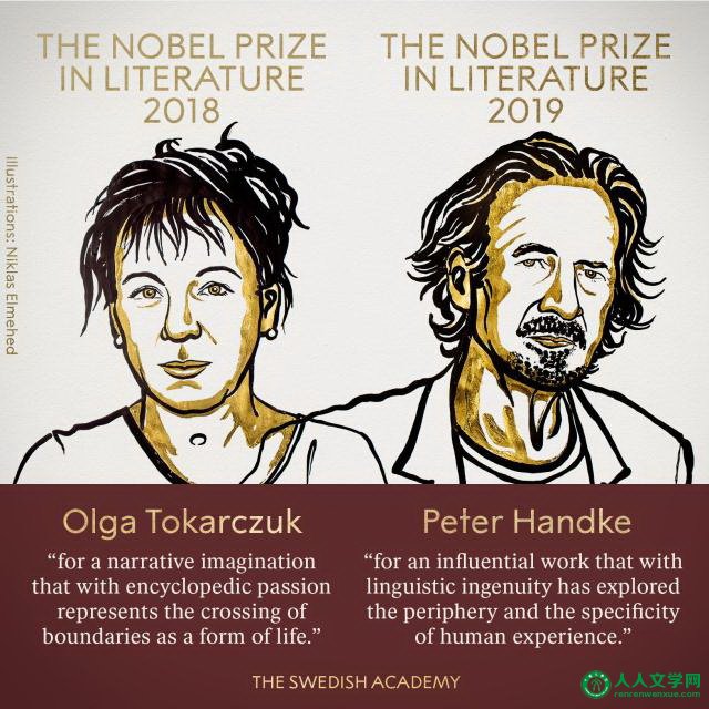 海外网10月10日电 当地时间10月10日,瑞典文学院宣布,将2018年诺贝尔文学奖授予奥尔加·托卡尔丘克(Olga Tokarczuk),将2019年诺贝尔文学奖授予彼得·汉德克(Peter Handke)。