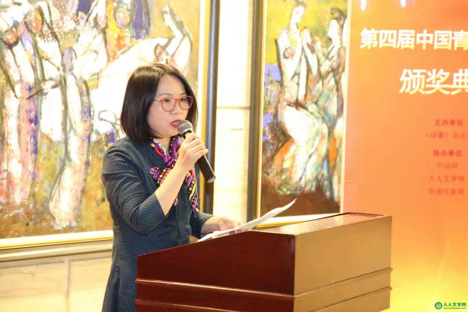 在颁奖仪式上,著名诗人陆健先生、潇潇女士给第四届中国青年诗人奖获得者熊曼颁奖。著名诗人汪剑钊先生、姜念光先生给第四届中国青年诗人奖获得者刘雅阁颁奖。