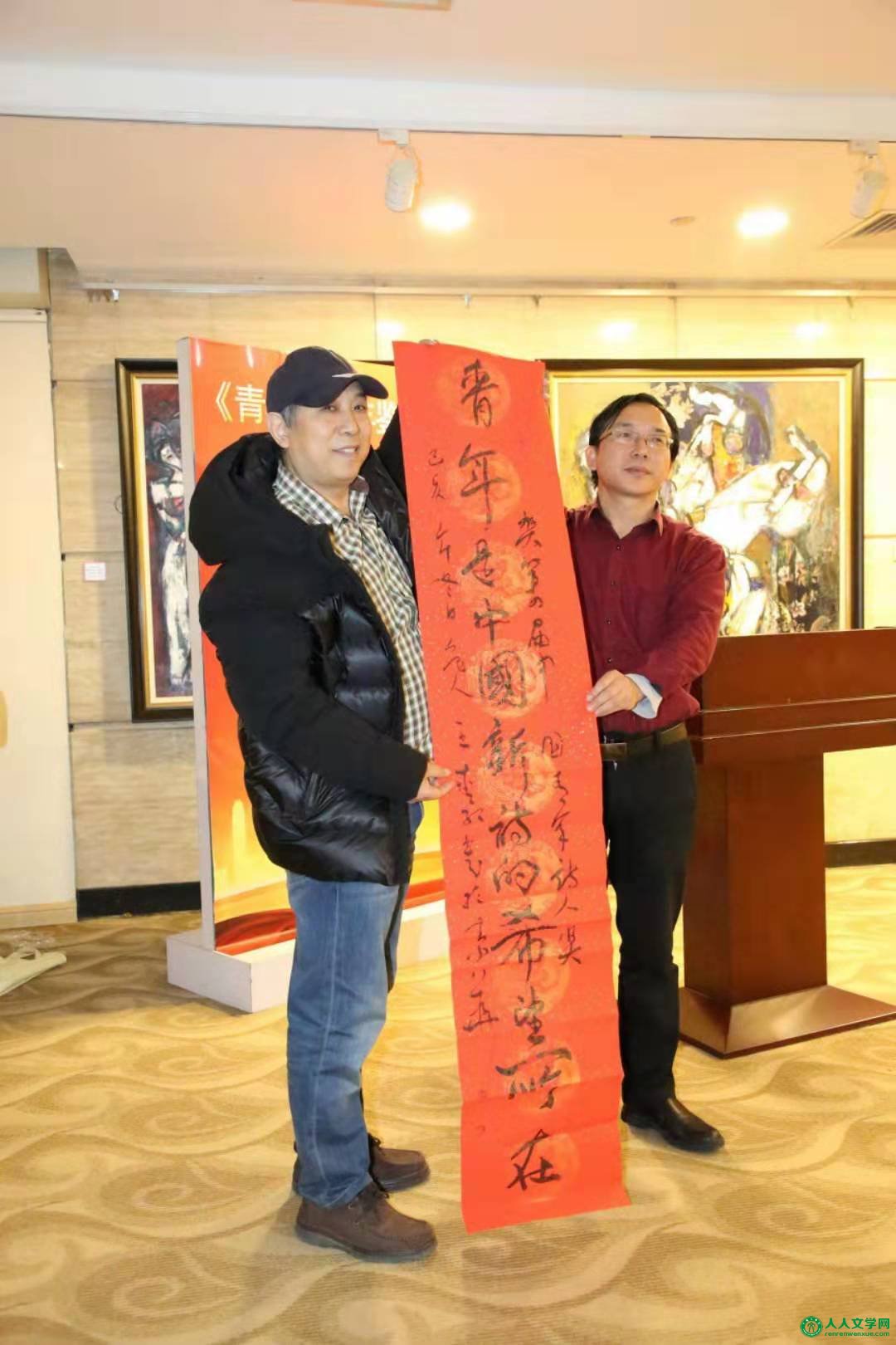 临了,第四届中国青年诗人奖组委会副主任王爱红先生代表组委会,特意向主编谭五昌先生赠送了一幅书法作品,上面书写:青年是中国新诗的希望所在,为首发式带来了情绪的高潮。