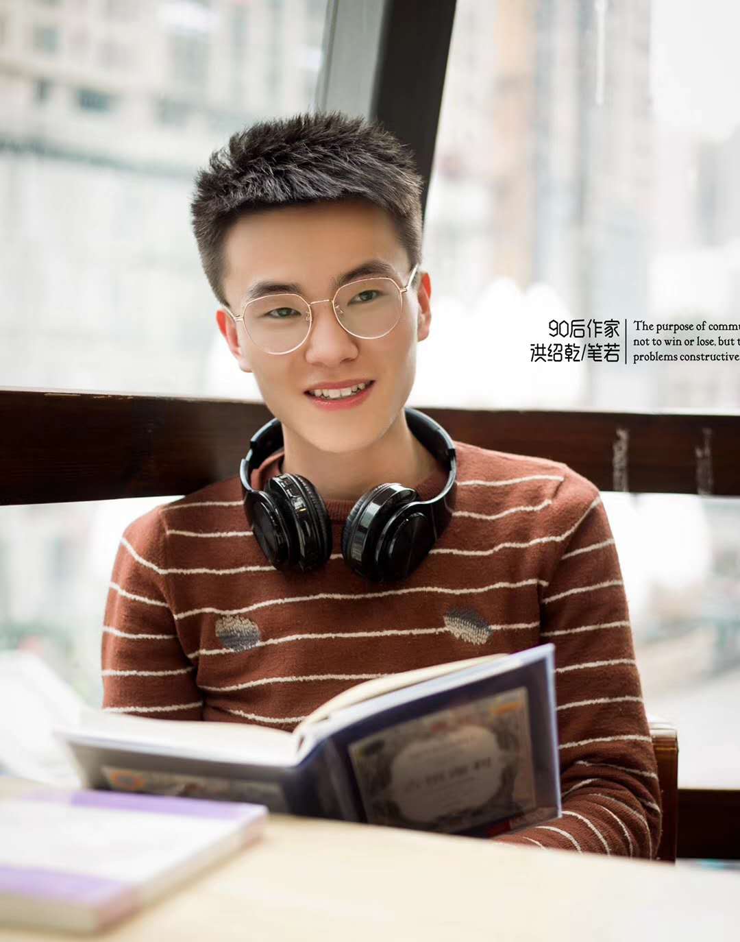 洪绍乾 笔名:笔若,90后作家、诗人。中国好品牌影响力艺术青年形象大使、中国诗歌学会会员、贵州省诗歌学会会员,贵州诗人协会会员、贵州省诗歌学会网站编辑部副主任,08年开始创作,先后出版书籍《脚趾上的下弦月》《女人和果实》等多部作品,书籍曾被北京清华大学图书馆收藏。发行过音乐专辑《诗人与歌》被上海人民广播电台播出、贵州省90后作家排行榜首榜人物、中国90后作家排行榜人物之一,曾获得“中国90后金笔作家奖”、“人人文学奖”并荣登共青团贵州省委主办的《青年时代》杂志封面人物等。