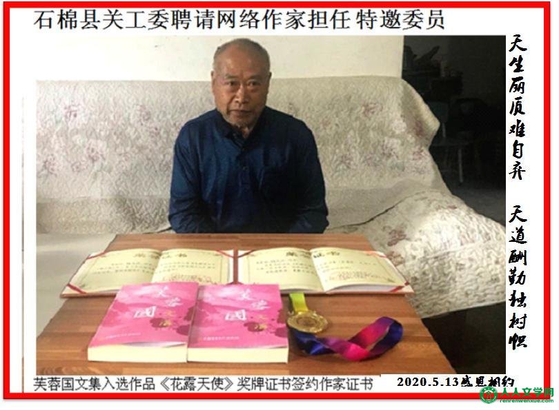一位年过花甲的退休教师,他没有骄人的业绩和绚丽的光环,他是通向共和路上的苔藓,一抹流淌的绿意;是一棵小草,默默地传播绿色希望。他教坛耕耘四十三年撒播知识的种子,退休不忘初心,关心下一代的健康成长—托起太阳:笔耕不止,为孩子们创作一百多万字的五部长篇儿童文学作品350多首校园乡村田园诗歌,还有散文乡村报告文学上百篇,他就是杨天云 男 笔名还是那片蓝天 退休教师,中共党员现年69岁 小学高级教师 他一生从事教育文化工作是“现代文化”的优秀创造者和书写者。他在石棉基础教育工程中成绩显著,优秀共产党员、县级优秀教育工作者。2019年被评选为“石棉好人”。2020年5月13日为充分调动社会各界爱心人士关心关爱未成年人健康成长的积极性,石棉县关心下一代工作委员会聘请中国网络作家和诗人杨天云为县关委特邀委员。2018年4月受邀中国网络作家协会会员。201911.1应邀加入中国乡村作家会员。2020.4.28应邀《芙蓉国文汇》签约作家。