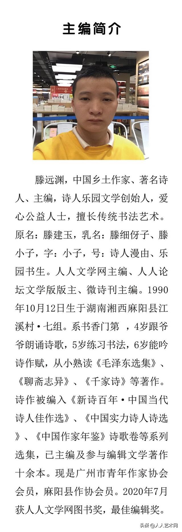 主编:滕远渊,中国乡土作家、诗人、主编,诗人乐园文学创始人,爱心公益人士,擅长传统书法艺术。原名:滕建玉,乳名:滕细伢子、滕小子,字:小子,号:诗人漫由、乐园书生。人人文学网主编、人人论坛文学版版主、微诗刊主编。1990年10月12日生于湖南湘西麻阳县。系书香门第 ,4岁跟爷爷朗诵诗歌,5岁练习书法,6岁能吟诗作赋,从小熟读《毛泽东选集》、《聊斋志异》、《千家诗》等著作。诗作被编入《新诗百年·中国当代诗人佳作选》、《中国实力诗人诗选》、《中国作家年鉴》诗歌卷等系列选集,已主编及参与编辑文学著作十余本。系广州市青年作家协会会员,麻阳县作协会员。