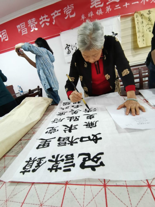 市老年书画协会的书法爱好者挥毫泼墨,将诗联学会创作的诗词、警句、格言作品书写下来,书法爱好者们各显身手,作品形神兼具,形式不拘一格,行书、隶书等各具特色,或苍劲有力,或刚健质朴,或灵动秀气。现场翰墨飘香,气氛热烈融洽。