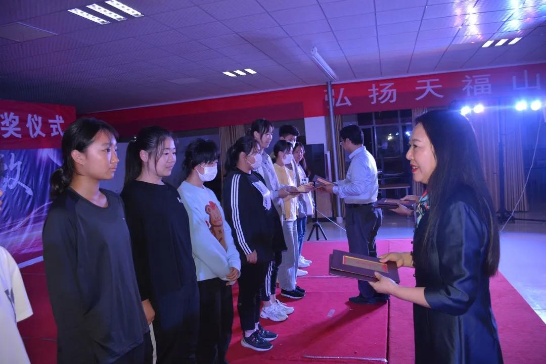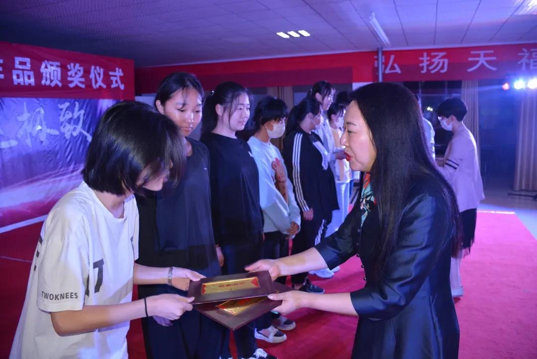 ▲著名诗人潇潇与李凌己校长为获奖学生颁奖