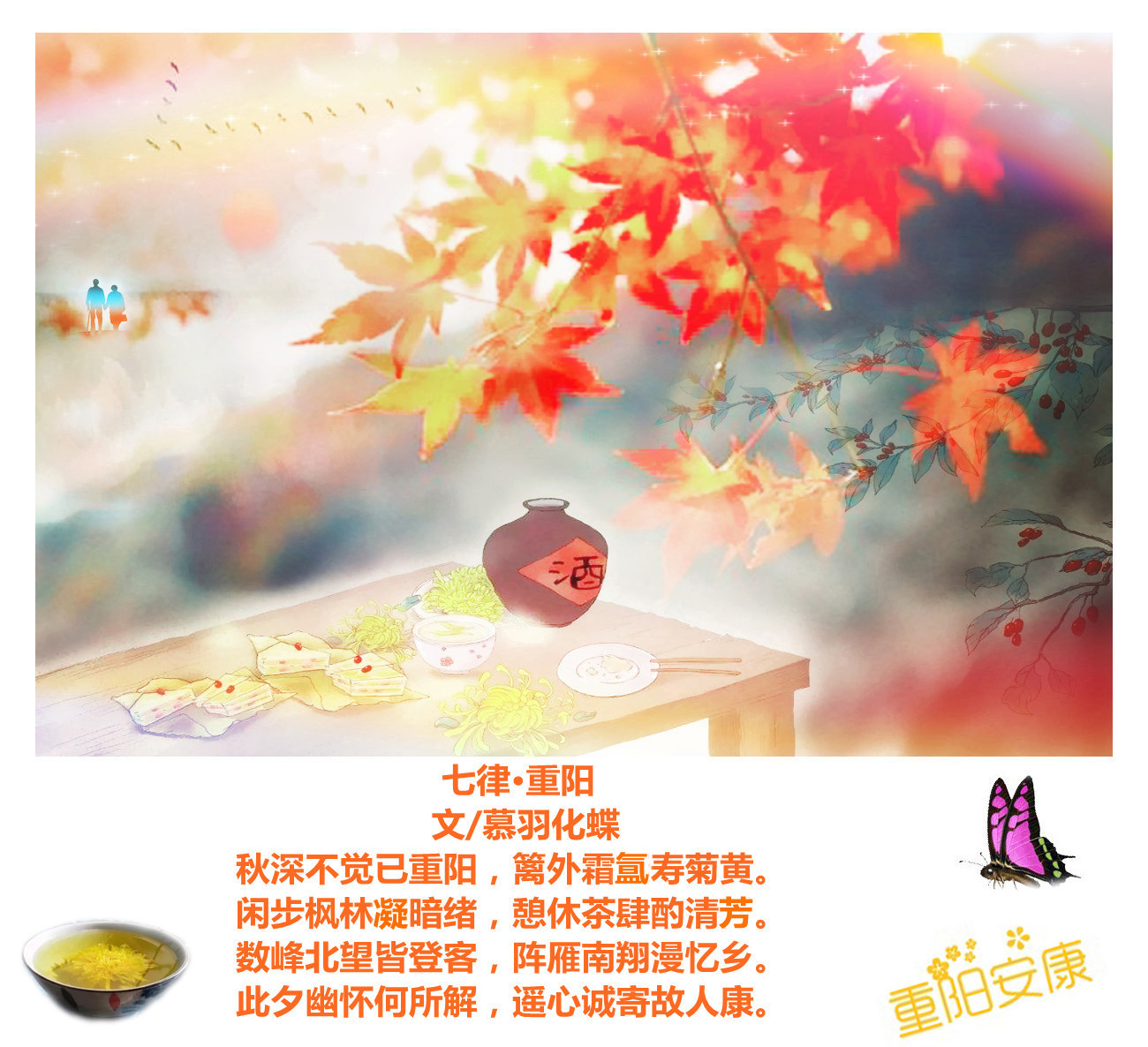 秋深不觉已重阳,篱外霜氲寿菊黄。 闲步枫林凝暗绪,憩休茶肆酌清芳。 数峰北望皆登客,阵雁南翔漫忆乡。 此夕幽怀何所解,遥心诚寄故人康。