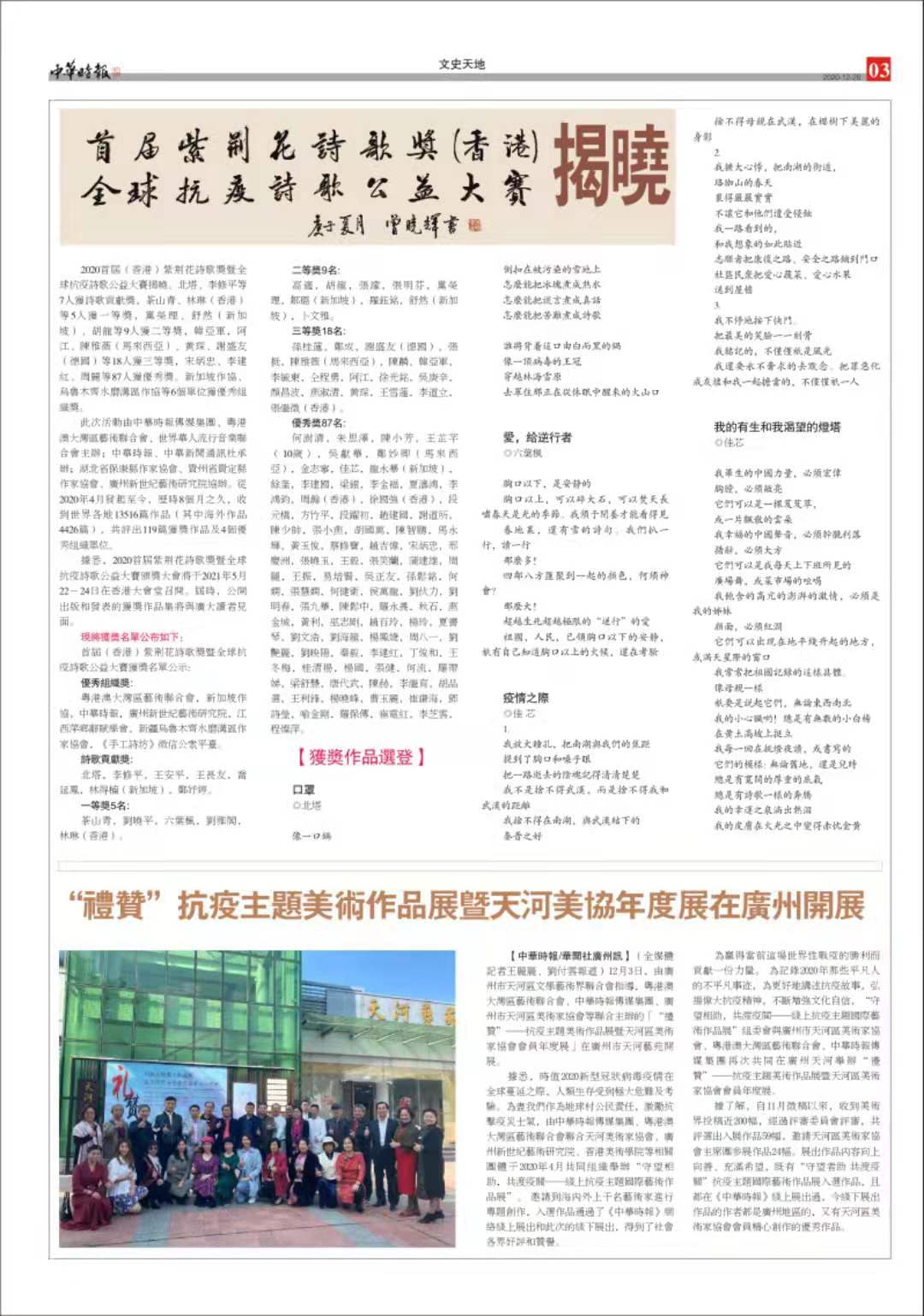 据悉,2020首届紫荆花诗歌奖暨全球抗疫诗歌公益大赛颁奖大会将于2021年5月22-24日在香港大会堂召开。届时,公开出版和发表的获奖作品集将与广大读者见面。