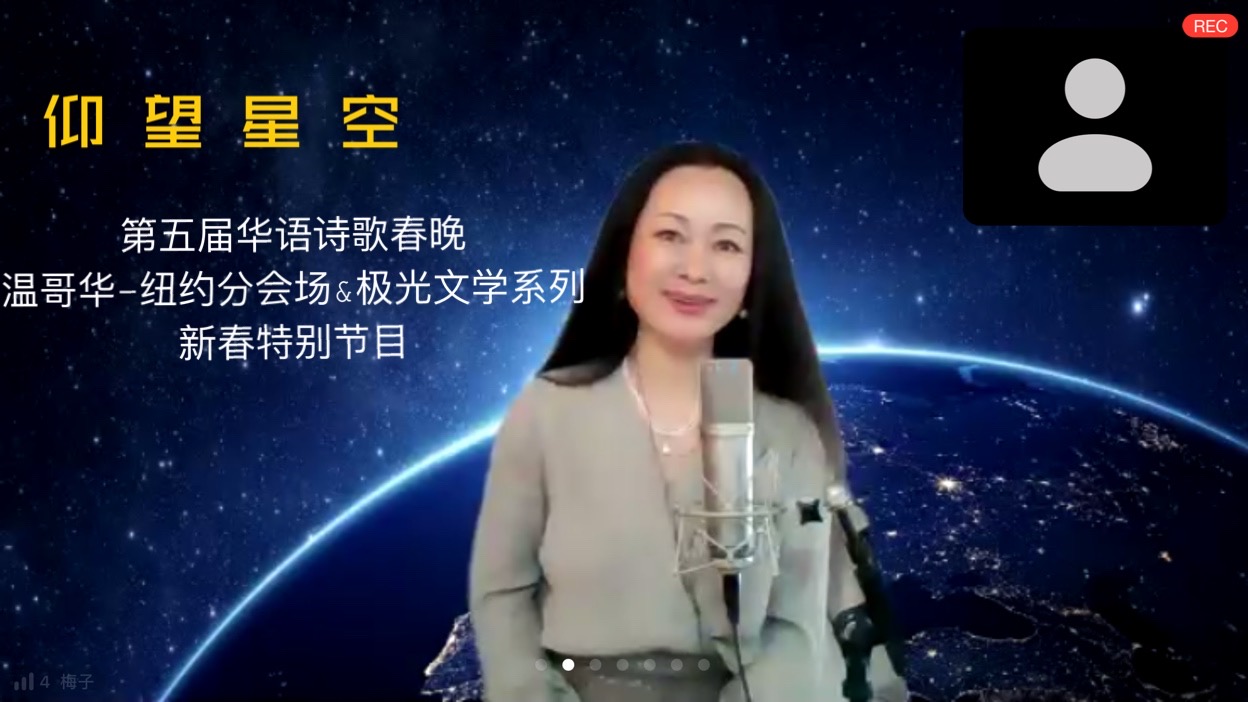 (乐活讯)二月二十日落幕的一场远离大陆本土,在云端成功举办的“ 仰望星空——第五届华语诗歌春晚温哥华~纽约分会场云诗会暨极光文学系列新春特别节目”, 犹如一道划过北美夜空的极光,闪现百年新汉诗之瑰丽。温哥华当地时间下午五点、纽约时间晚上八点、北京时间二十一日上午九点,身处三个不同时区的海内外学者专家、诗人作家、诗友诵友和读者们同时上线,聚集到zoom虚拟会议厅,共享一场别开生面的云端诗会。
