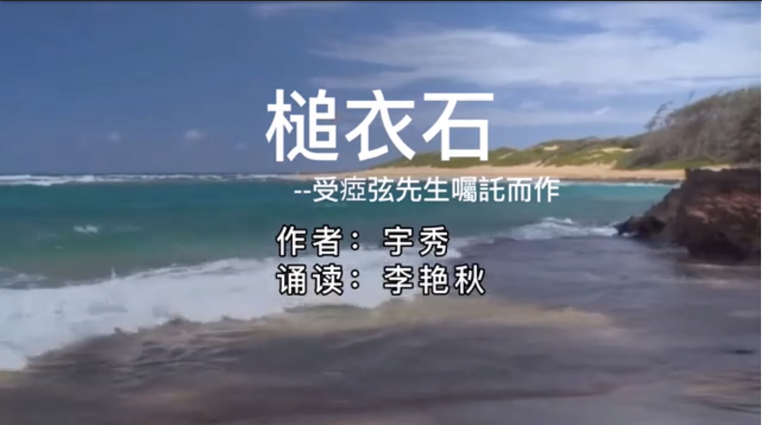《槌衣石》是作者受旅居在温哥华的诗坛前辈痖弦先生所托而作,由大陆影视明星、导演李艳秋用痖弦先生的家乡话南阳方言朗诵,配以河南地方特色的大调三弦,那两岸隔绝,骨肉分离的浓黑的乡愁诗韵,深深触动了每一个在云诗会上的观众,正如中山大学教授金钦俊老先生当初读到此诗所言:“ 谢谢宇秀的《槌衣石》,让我们得以亲炙痖弦先生的世纪之痛!” 然而,这块石头,岂止是个人和家庭之痛?实乃民族之殇!