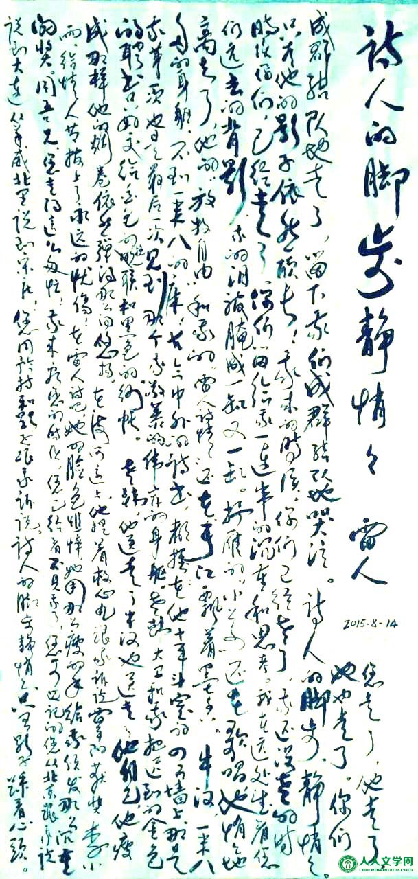 ![]() 诗人的脚步,静悄悄——第五个追悼会 雷 人 —————— 您 走了 他 走了 她也走了 你们,成群结队地 走了 留下我们,在 这里,成群结队地 哭泣 —————— 诗人的脚步 静 悄悄 只有他们的影子 依然 颀长 —————— 我来的时候 他们都已经老了 我还没老 他们就走了 你们 留给我 一连串的沉重和思考 我在远处望着 您 们 远去的背影 我的泪 被 腌成一缸 又 一缸 —————— 抒雁的小草 还在歌唱 他,悄悄地离去了,他 的《放牧自由》和我的 《雷人诗情》 还在“长江”飘着 墨香 牛汉 一米八多的身躯 不到 一米八的床,古今中外的诗书,都 挂在他10平斗室的 四面 墙上 那是我第一次也是我 最后一次,见到 那个我 敬慕 的 高大的身影 老韩大卫和我,把迟到的金色的聘书,只好 交给白色的挽联和 黑色的 纱帐 老韩,他,瘦成那样 他的烟圈 弹得依然悠扬,他 在海河边上 他捏着救心丸,跟我诉说雷平阳的 获奖 李小雨 给情人节,披上了 永远的忧伤 在雷人诗吧,她,留下 她永远不变的身影,她的脸色憔悴,她穿着黄衣裳,她用瘦削的手,给我 颁发 那么沉重的 奖 ———————— 八宝山的草,在 疯长,小草的歌声 没有 月亮 ———————— 同吾兄,您为什么 不让我们去看你?我来看你的时候,您 已经看不见我!! (泪流满面!) 我认识你,其实,才一年多,从华威北里你跟我说到宋庄,从北京 说到大连 您,用矜持和影子 跟我 诉说 ———————— 诗人的脚步 静悄悄 只有影子 踩着心头 ———————— 2015-0811 火曜 03:12 ---06:23 YY |